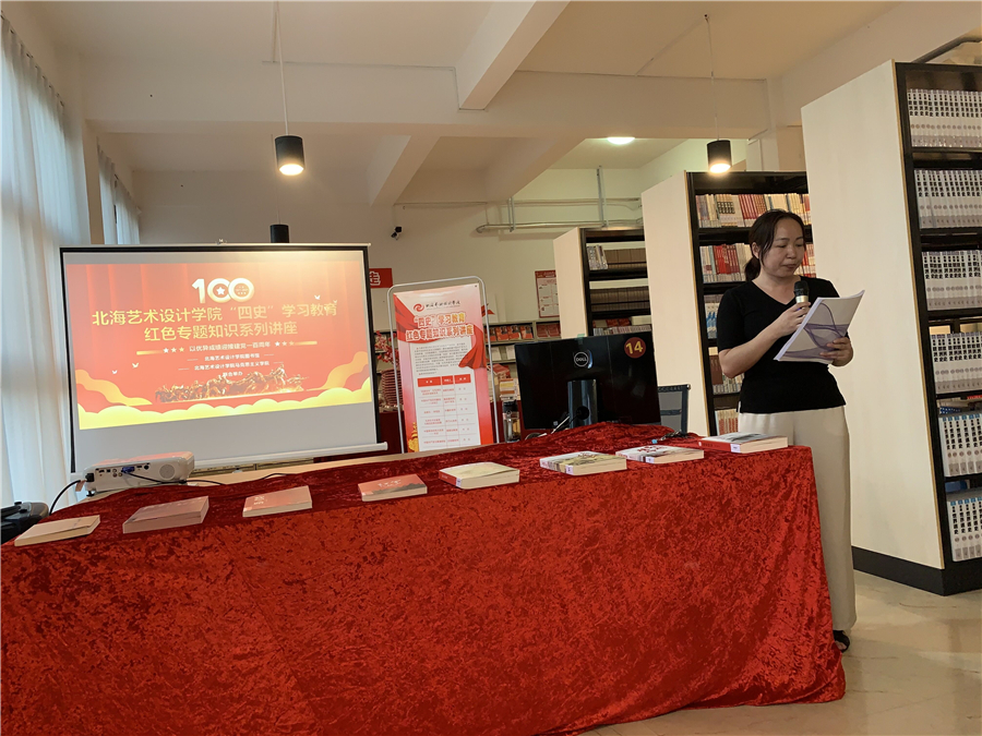 为迎接中国共产党成立100周年,深入学习贯彻落实习近平总书记在党史学习教育动员大会上的重要讲话精神,5月14日晚7点,由北海艺术设计学院图书馆与马克思主义学院联合推出的“四史”学习教育红色知识专题系列讲座在学校图书馆红色书籍阅读角开讲。