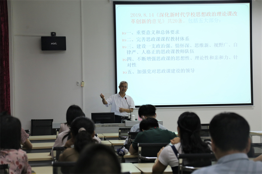 汤志华教授作题为《新时代深化思政课教学改革的思考》的讲座,他分别从《关于深化新时代学校思想政治理论课改革创新的若干意见》、《深化新时代教育评价改革总体方案》、《关于加强新时代马克思主义学院建设的意见》、《关于进一步加强高校马克思主义理论学科建设的意见》这四份重要文件来讲解新时代思政课教学改革的方向。