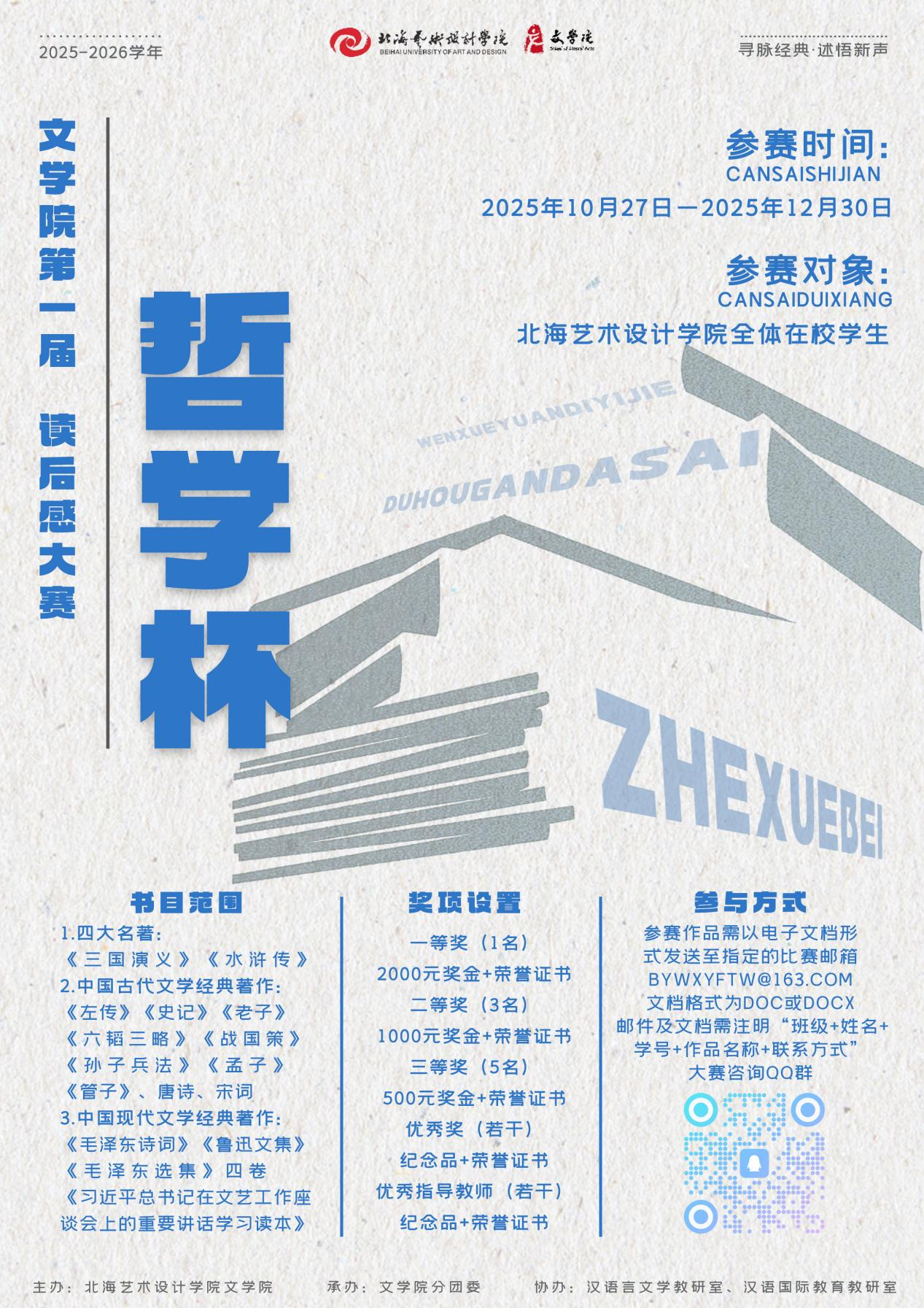 为深入贯彻新时代全民阅读理念,引导广大青年学子经典中汲取思想力量,在哲思中涵养精神品格,北海艺术设计学院文学院2025年10月27日至12月30日