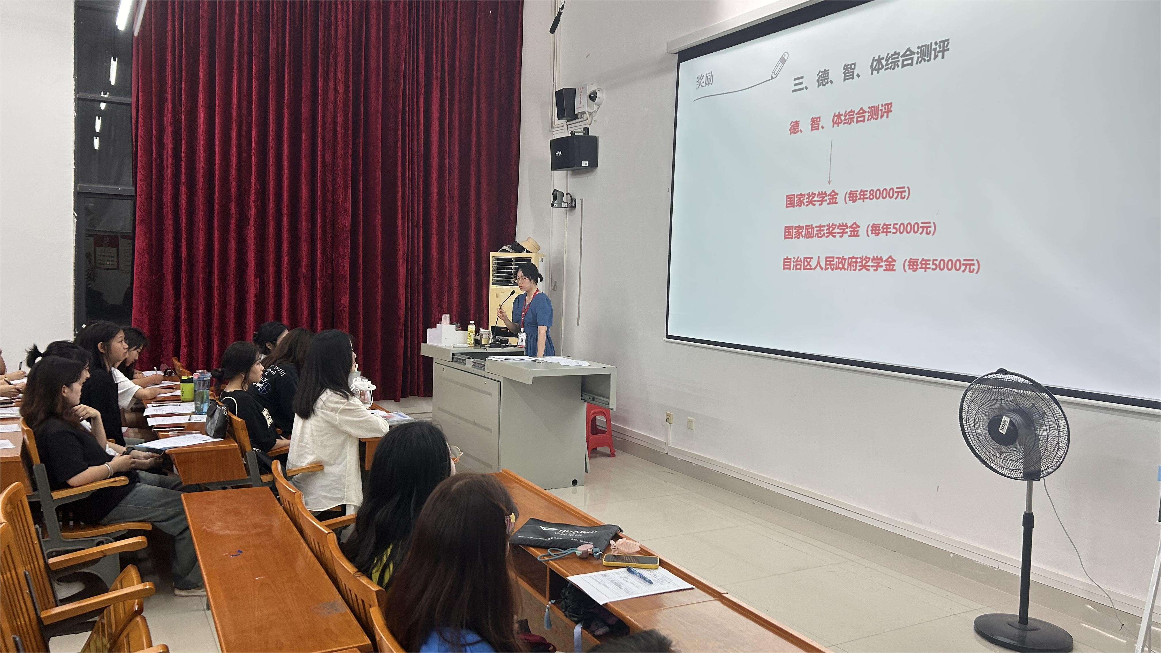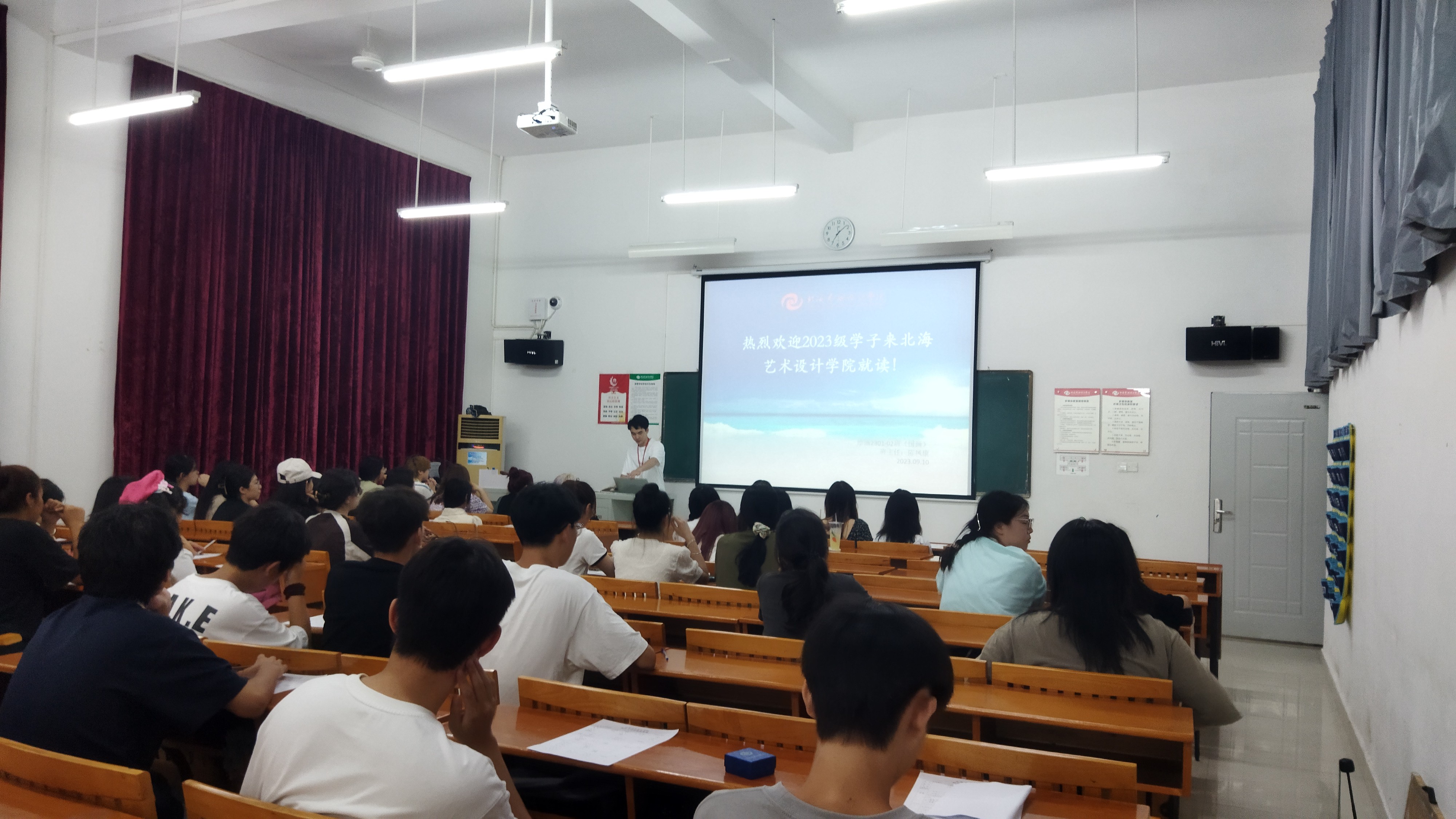 9月10日,美术学院新生辅导员为2023级各班新生举行“第一次班会”,在班会中,各班班级辅导员为新生全面地介绍了北海艺术设计学院,带领新生了解美术学院的教学课程、活动安排以及教学理念等。同学们对于未来的大学生活充满了憧憬,对于独立生活的困惑也向辅导员倾诉,美院各班新生辅导员耐心听取了同学们的心声,与新生进行了入学第一次交心谈话。班会上,辅导员们教导新生:要心系国家事,肩扛国家责。要度过健康积极的大学生活,担负起青年一辈肩上的责任,力求感受广阔的社会现实和伟大的时代进程,树立好“强国有我”价值导向。(许荣军 摄)