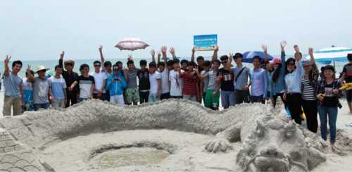 与此同时,沙雕比赛也在紧张进行当中。各班参加沙雕制作的同学,在海边规定的区域内进行各自的沙雕创作。放眼望去,海滩上高手云集,挖沙、铲沙,堆沙,筑造,各班参赛队伍忙碌起来有条不紊、井然有序。中午1:00,各班参赛作品基本完成。一件件精美的沙雕艺术作品展现在全体师生和广大游客面前,赢得了大家的争相拍照和啧啧称赞。
