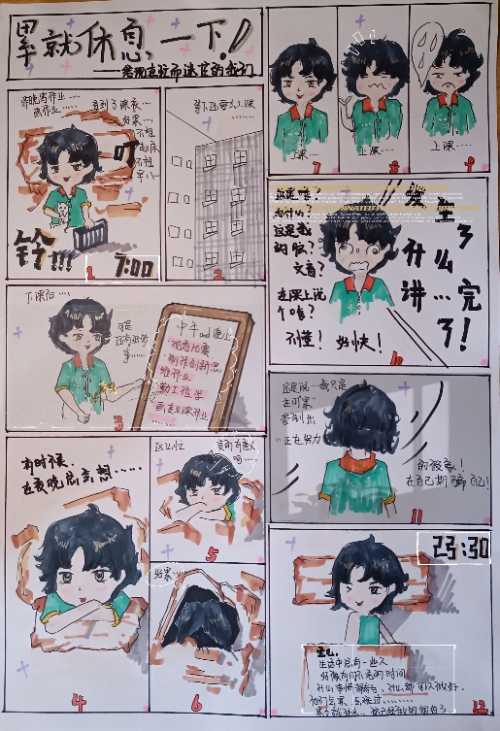 马敏同学的《累就休息一下吧》获得二等奖,作品介绍在大学,没有了一切为我们撑腰的父母,没有时刻教育我们的老师,没有知根知底无话不谈的朋友,自己一个人在这座陌生的城市,在这所陌生的学校,我们会感到累与迷茫兼并着。我们每天基本过着相同的生活,对自己的未来不知道如何规划,可能只是瞎忙,让自己的心理与身体感受到累。这时候,我们应该适当的停下脚步,思考自己应该如何去规划,适当休息,调整自己。