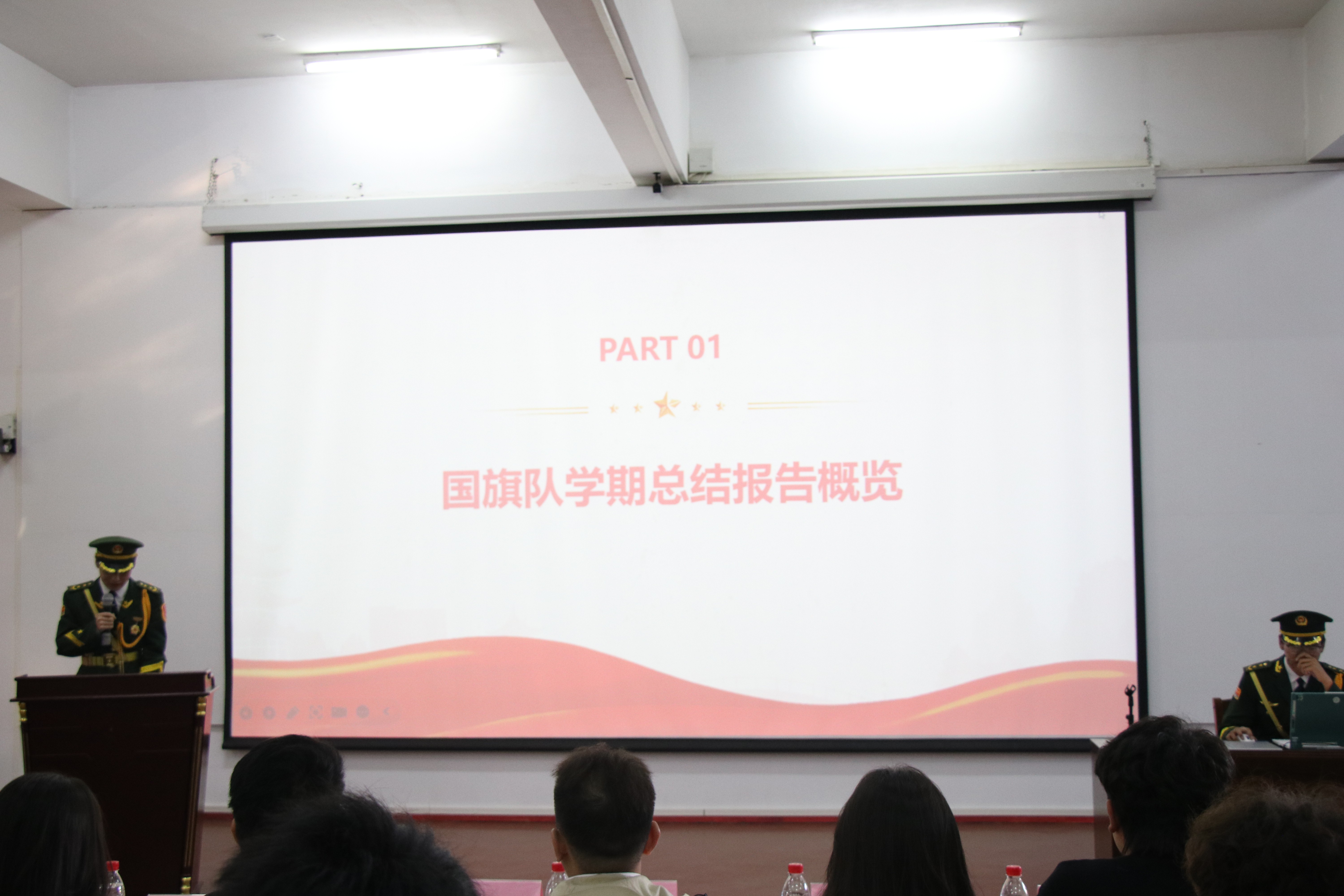 国旗队负责人赵鹏凯汇报了本学期的训练成果和升旗仪式中的经验教训。他表示,国旗队在定期集中训练和心理素质培养方面取得了显著进步,但仍需提高时间规划和应对突发情况的能力。未来,国旗队将制定更加合理的训练计划,加强团队协作,提升整体素质。