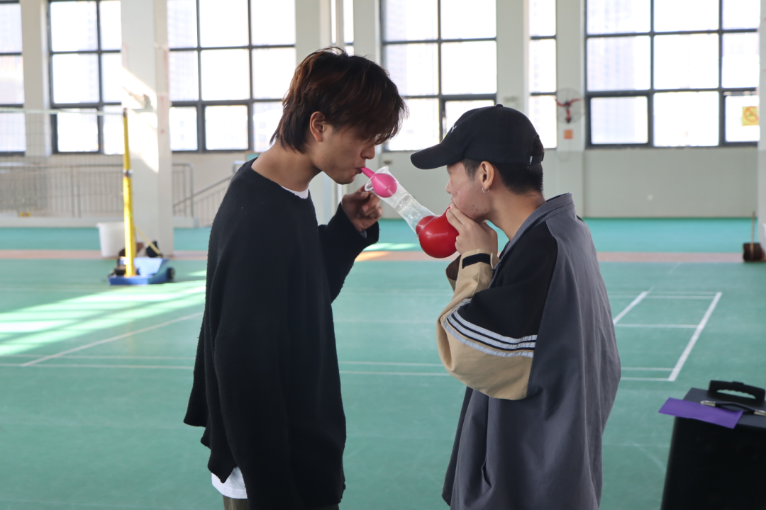 第三个游戏是气球传纸杯。这个游戏考验的是团队协作,同学们通过气球的传递,可以增强团队协作能力。首先由一位同学用气球将纸杯撑起来,然后将举杯的另一端递给另一位同学,两方一起合作,将纸杯传递下去
