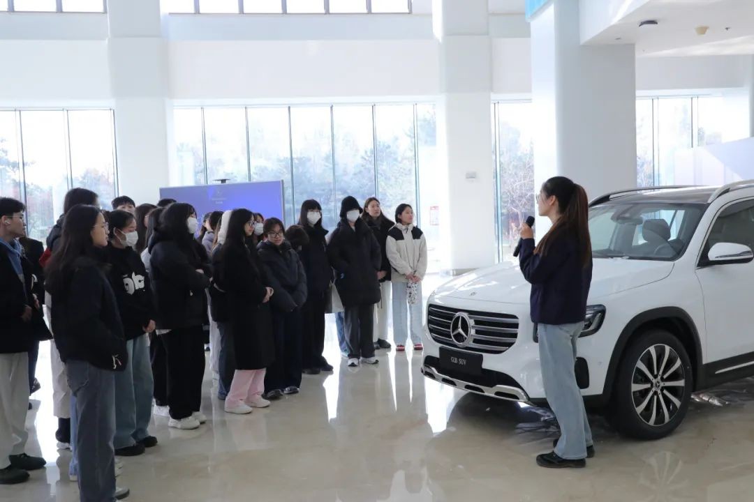 在此次考察活动中,考察团队首先到达北京奔驰汽车有限公司参观了奔驰园区,了解了该公司在汽车设计与技术创新方面的杰出成就。在工作人员的讲解下,学生们深入了解了奔驰的品牌历史、全球布局和在豪华车市场中的领导地位。在展车介绍和体验中,考察师生们还进一步了解了各款车型的性能特点和市场定位,感受了汽车设计的复杂性与精密性,领略了奔驰品牌背后强大的设计哲学和技术积淀。