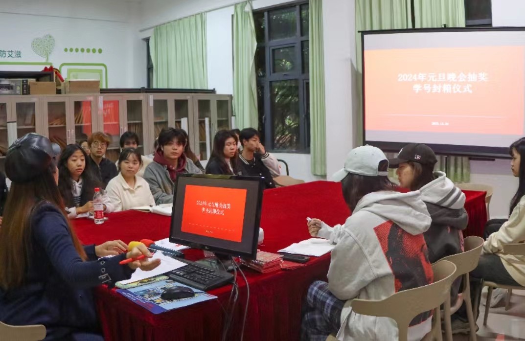 12月26日在行政楼118开展2024年元旦晚会抽奖活动封箱仪式,出席本次仪式的有:学工处副处长马啸老师、团委副书记宋慧敏老师、团委副书记杨美琪老师以及各二级学院学生代表。