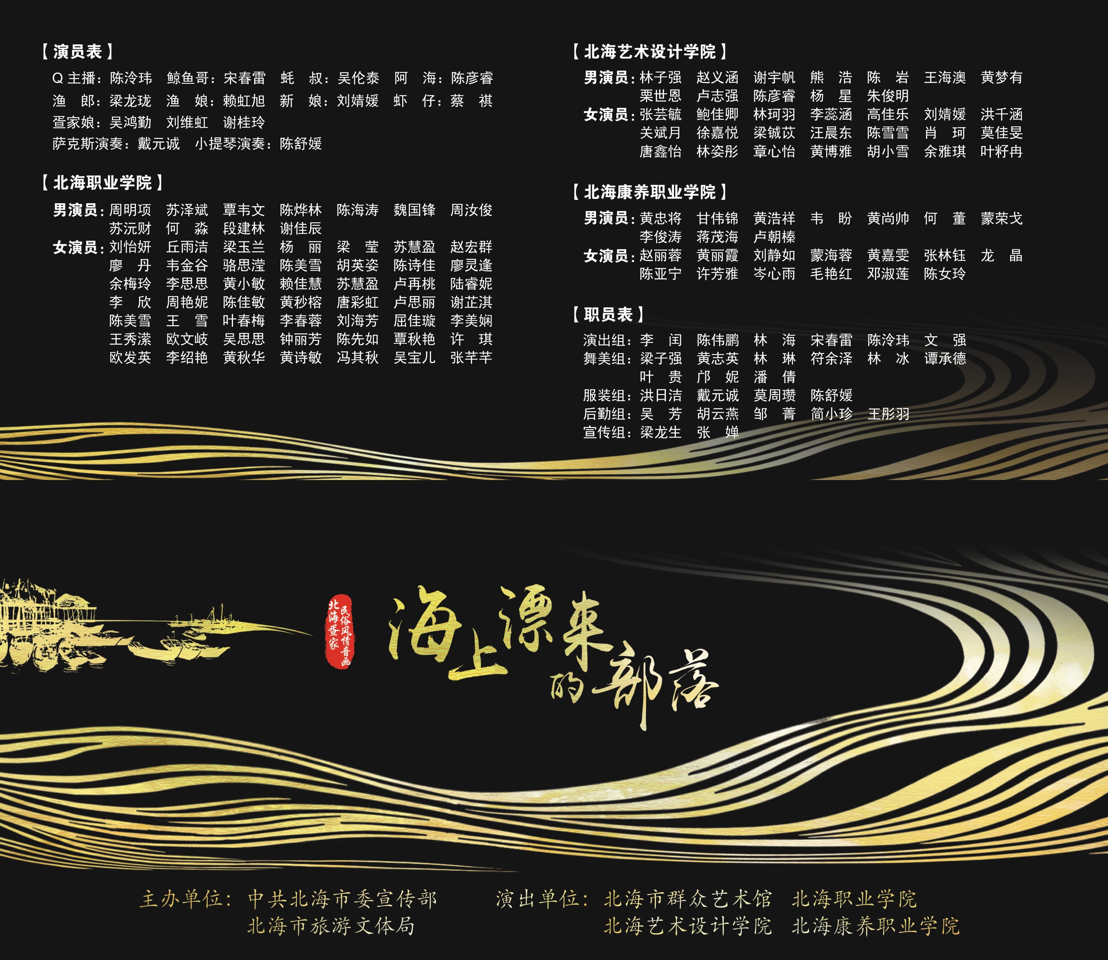 2023年12月30日、31日晚上,由中共北海市委宣传部、北海市旅游文体局主办,由北海市群众艺术馆、北海艺术设计学院、北海职业学院、北海康养职业学院联合出演的北海疍家民俗风情音画《海上漂来的部落》在北部湾广场百姓大舞台完美落幕,给北海市民送上了一份新年大礼,为北海增添了喜庆的节日气氛。