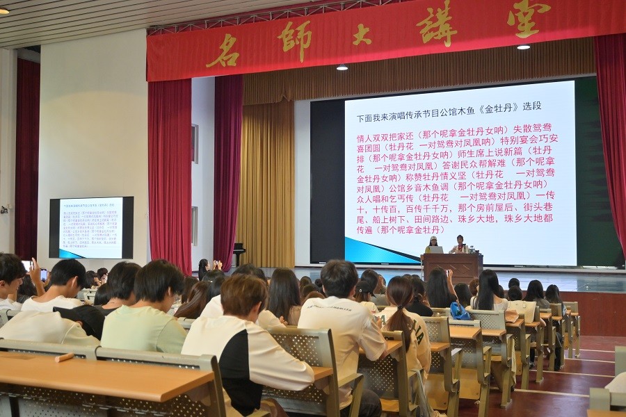 活动当天,舞蹈学院内洋溢着浓厚的文化氛围。来自舞蹈表演专业的数百名学生齐聚一堂,精神饱满地准备迎接这场特殊的课程。与此同时,我们有幸邀请到广西非物质文化遗产“合浦公馆木鱼”第四代传承人 、广西戏剧家协会会员、原北海市戏曲家协会副主席、合浦县金牡丹艺术团团长廖烈莲老师的到来,她以其深厚的艺术功底和丰富的传承经验,成为此次活动的主讲人。