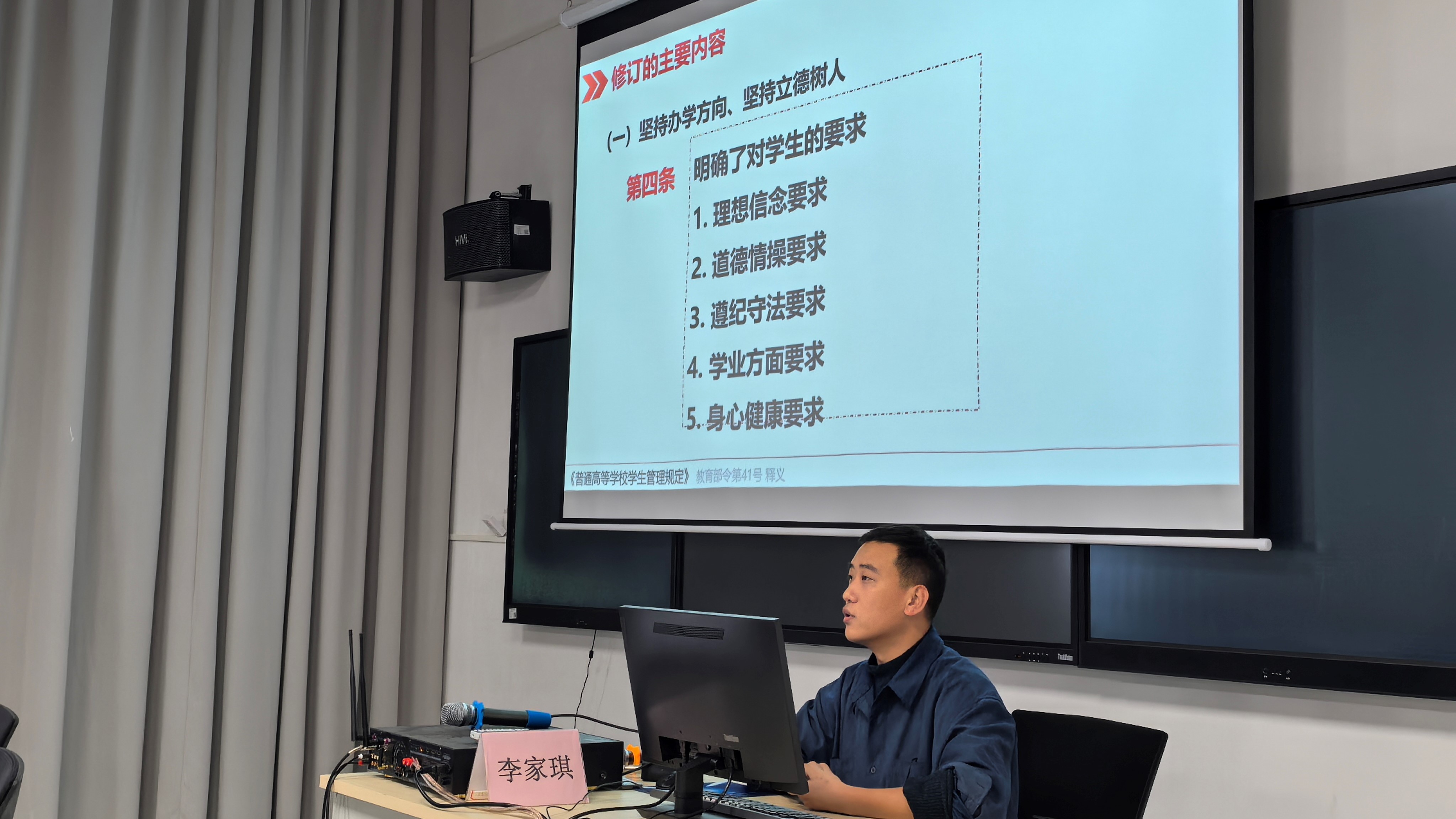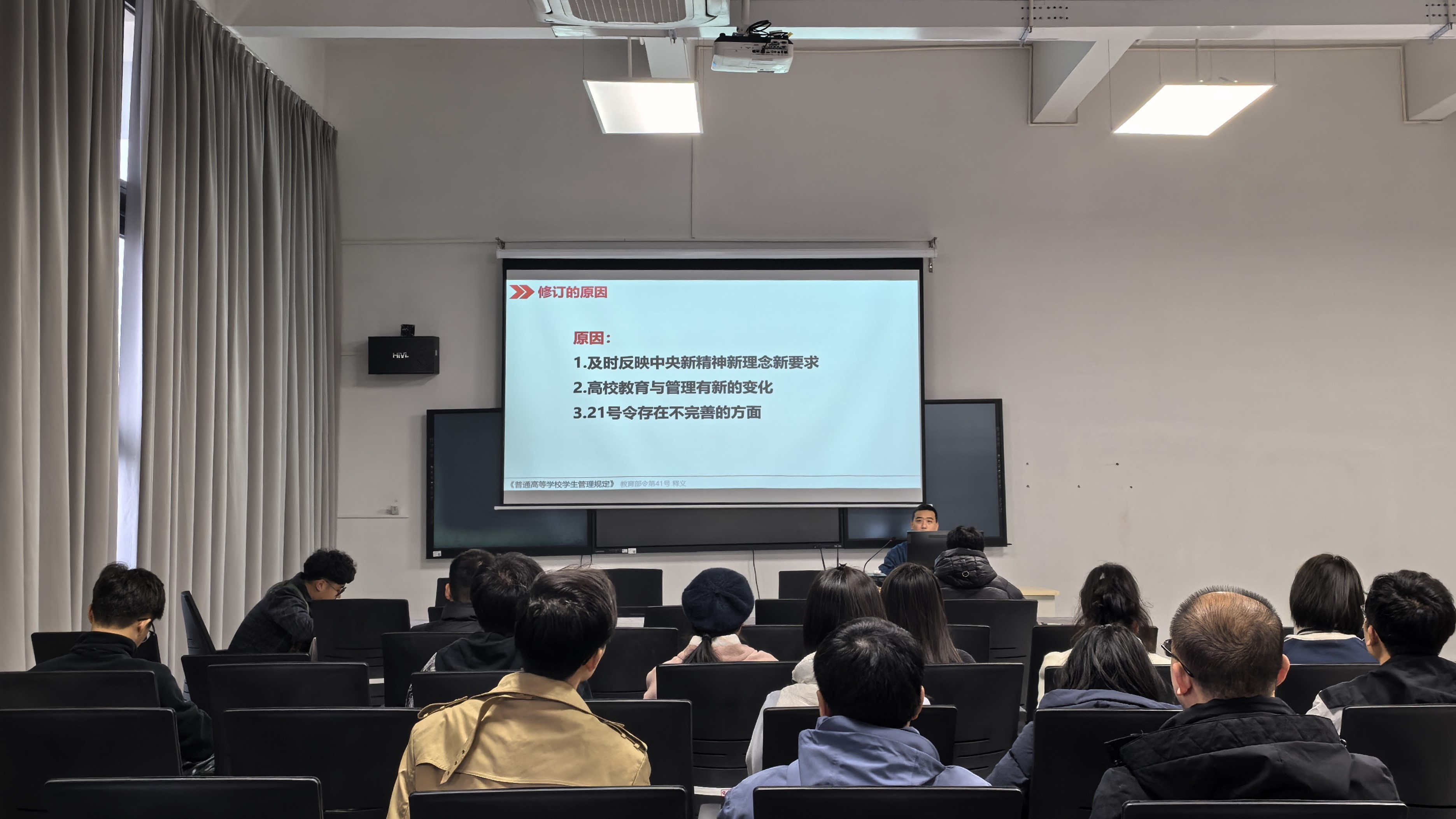 随后,书法学院学工办主任李家琪带领全体教职工学习《普通高等学校学生管理规定》(教育部令第41号)文件精神,对文件进行了详细的解读,解读内容包括学生的权利与义务、学籍管理、考核与成绩记载、转专业与转学、休学与复学、退学、奖励与处分等。