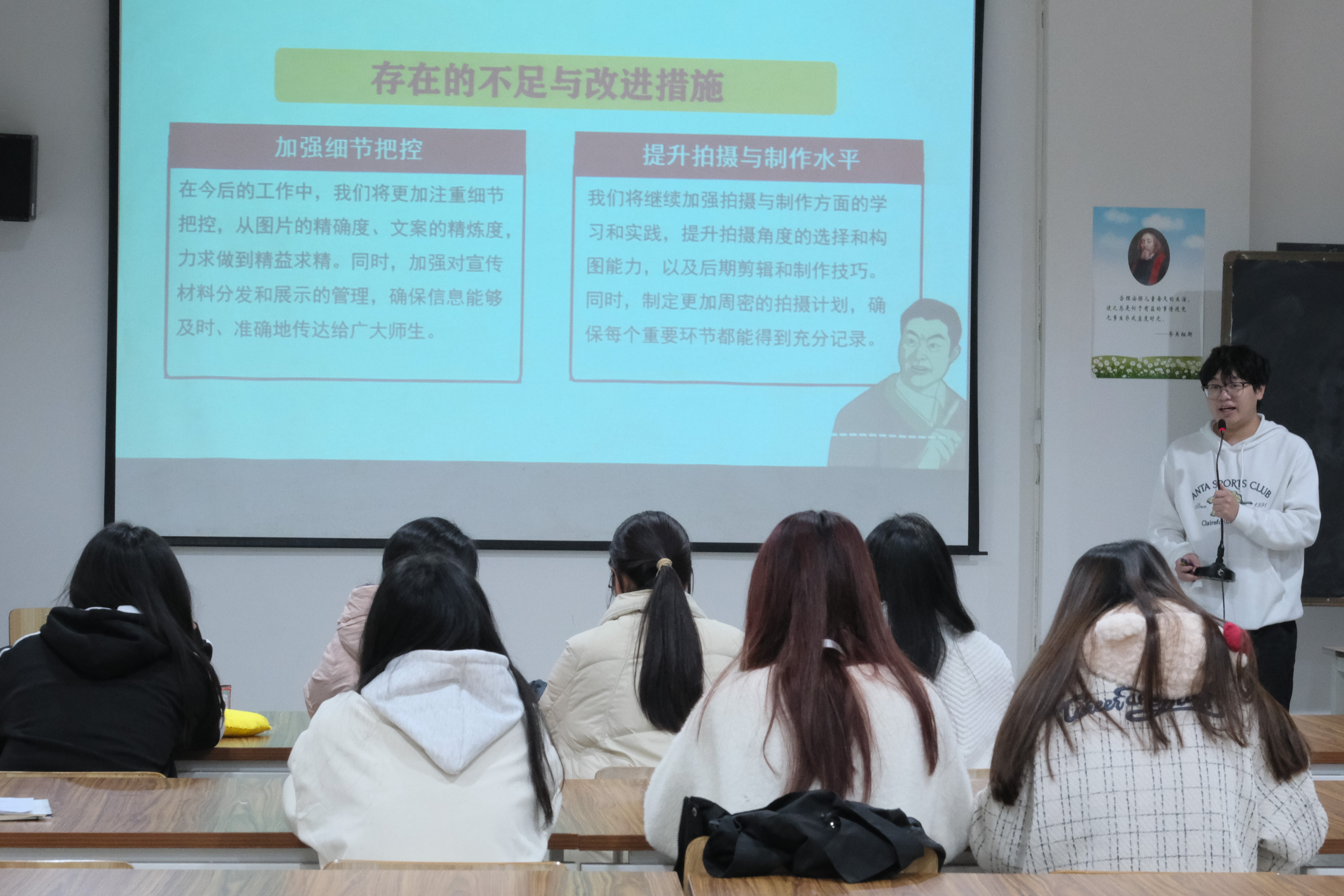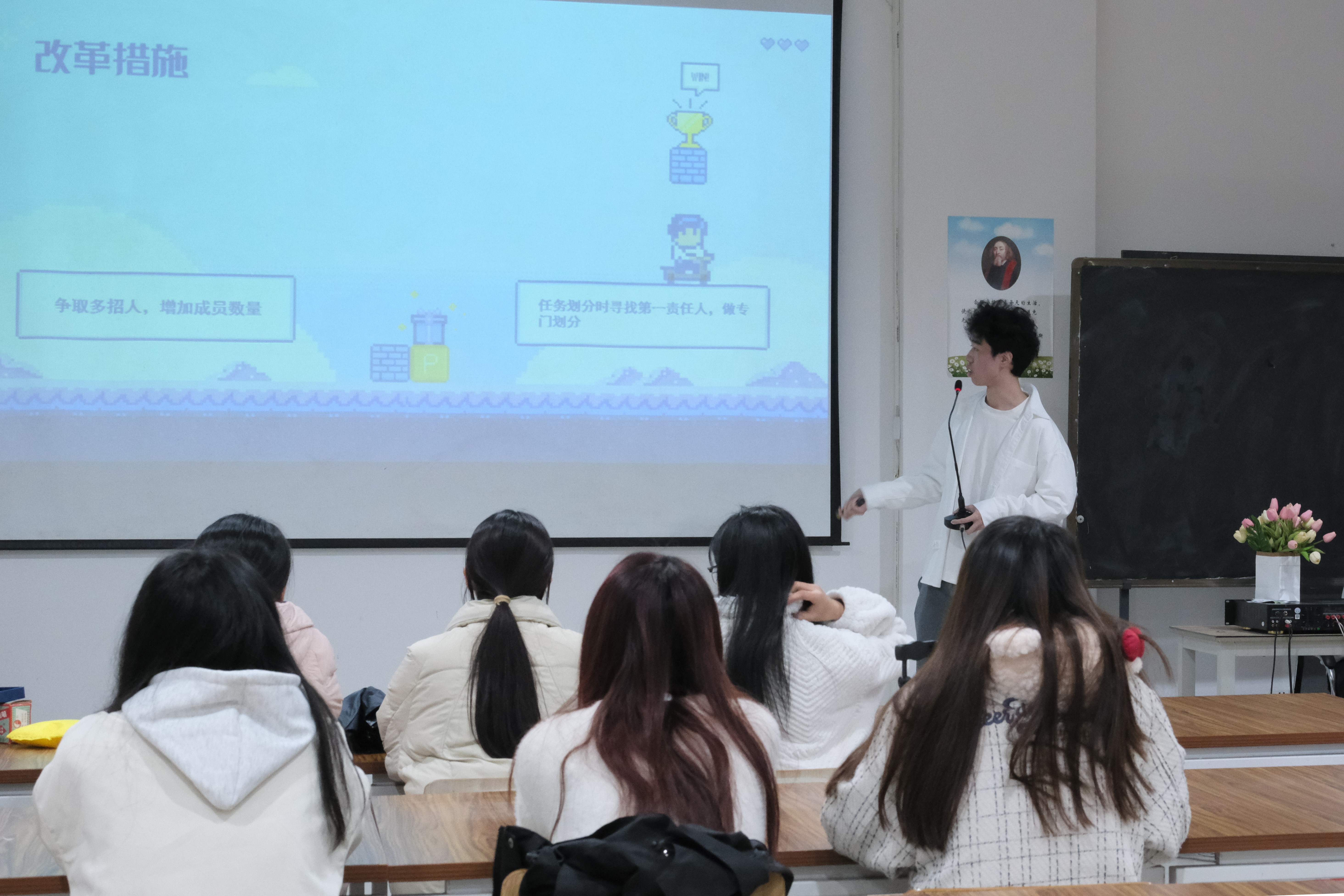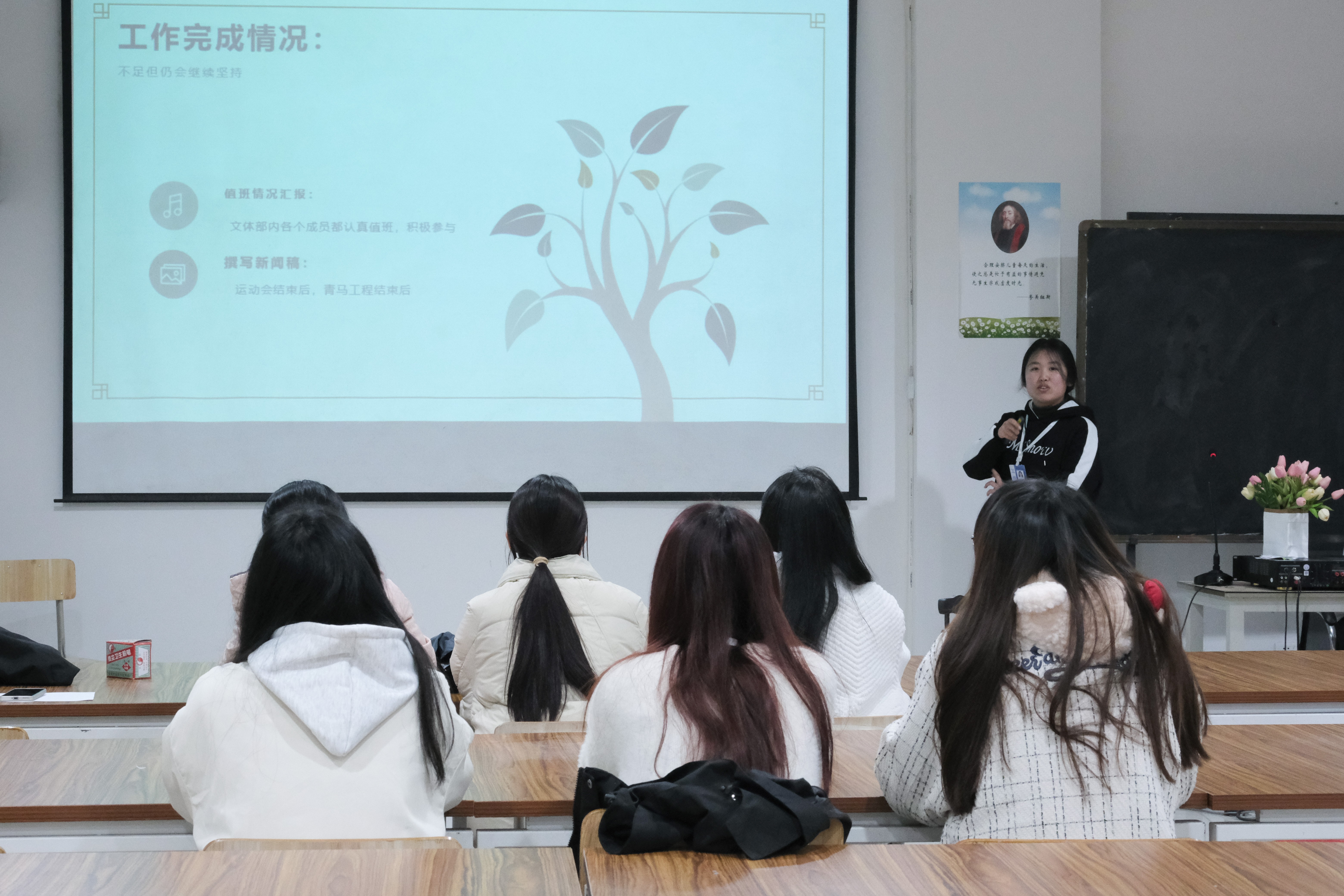 会议伊始,由各部门部长对本部门工作进行汇报,主要汇报各自部门的工作亮点、成果、遇到的困难与解决方案以及下学期的工作计划。随后由团总支主席张佳巾进行工作总结。