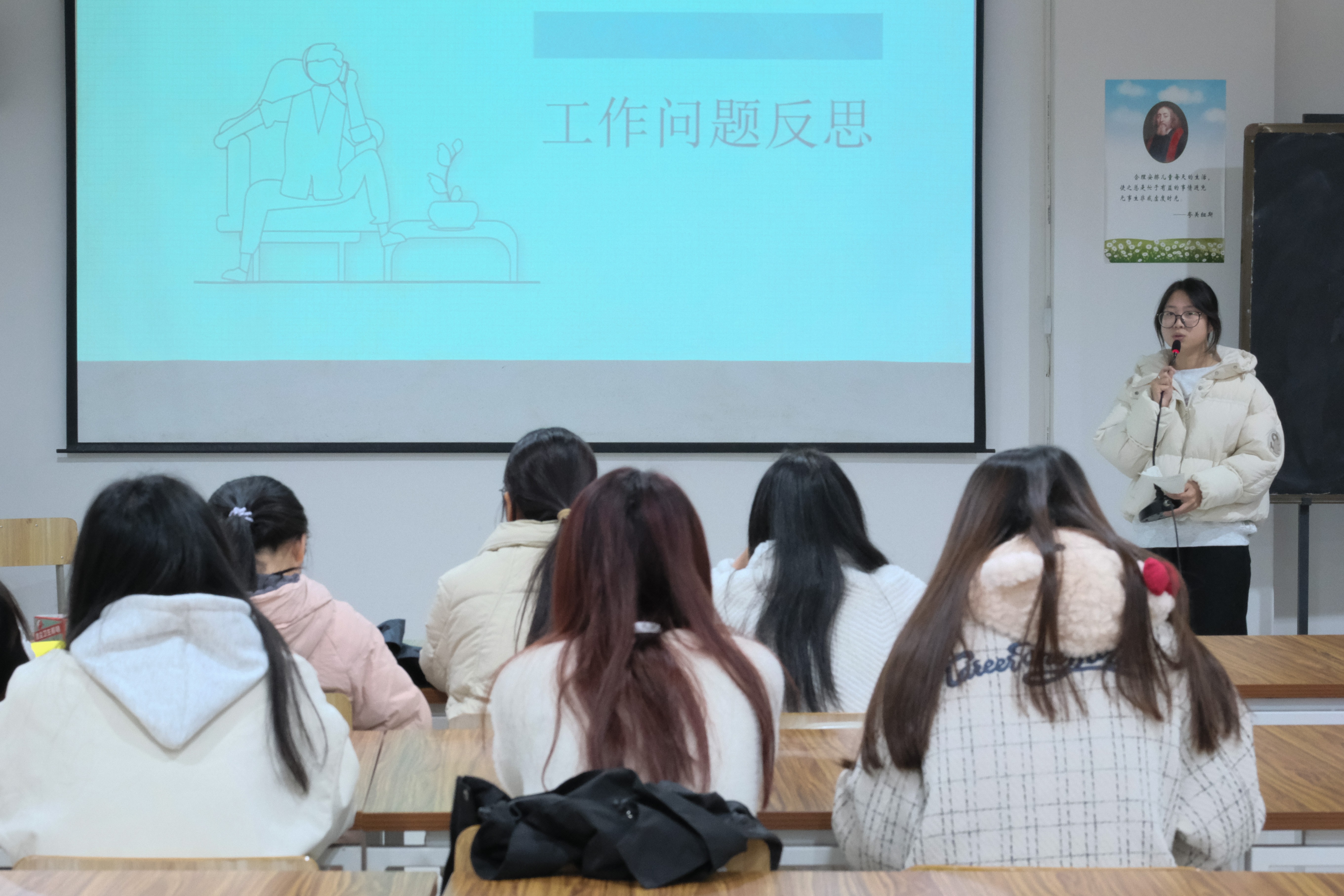 紧接着,陈美霖老师发表讲话。她教育学院团总支这一学期的辛勤付出和取得的成绩给予了肯定。同时,她指出目前团总支工作中存在的问题与不足,并给出了具体的整改建议。