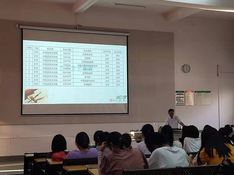 接下来黄教授着重介绍了我院汉语言文学专业的师资队伍、专业特色、培养目标、核心课程、就业岗位等方面的具体情况。黄教授指出,我院汉语言文学专业不仅从校外引进了高层次人才,而且近几年培养了一批年轻的优秀教师,这为我院汉语言文学专业的发展和学生们的求学提供了强有力的后盾,希望同学们可以在老师的教导下认真学习,提高自己的专业素养。另外,黄教授教导学生们要做好大学学习规划,尽力考取相应的证书,为就业打好基础。