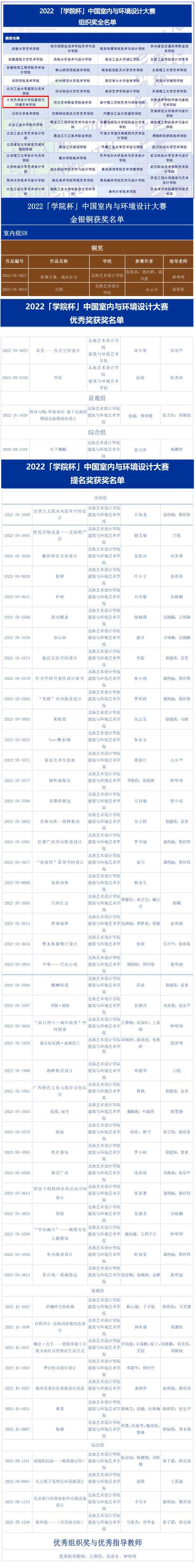 此次学院杯大赛得到了我校建筑与环境艺术学院领导的高度重视和支持,师生积极参与提交参赛作品一百多件,呈现了师生们关注新形势、新变化的空间设计思想,是学院通过“以赛促学”机制提升学生创新能力的重要体现。经过终评此次大赛我院师生获得可喜成果:优秀院校组织奖1项,室内组铜奖2项,室内组优秀奖31项,景观组优秀奖1项,综合组优秀奖1项,室内组提名奖38项,景观组提名奖7项,综合组提名奖4项,优秀指导教师3人。
