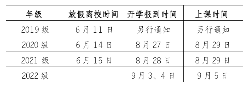 学生6月11日(星期六)至6月15日(星期三)错峰放假。2020级、2021级学生8月27、28日报到,8月29日开始上课;2022级新生9月3、4日报到,9月5日开始上课。