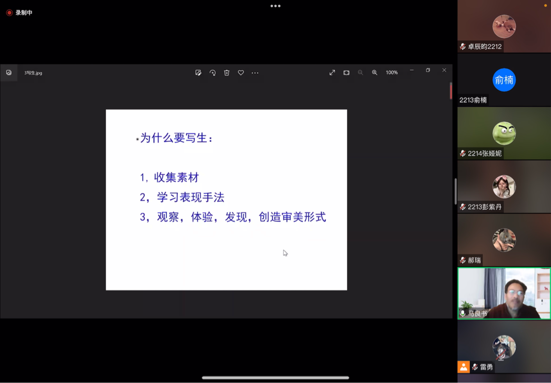 讲座最后,马教授告诉同学们,在写生时要懂得将自己平时所学习的方法运用到自己的画面中,写生的过程中要有主动性,但不能有主观性。希望同学们可以通过本次课程的学习,真正了解写生,热爱写生,从而绘出更生动完美的写生作品。(卓辰昀/摄)