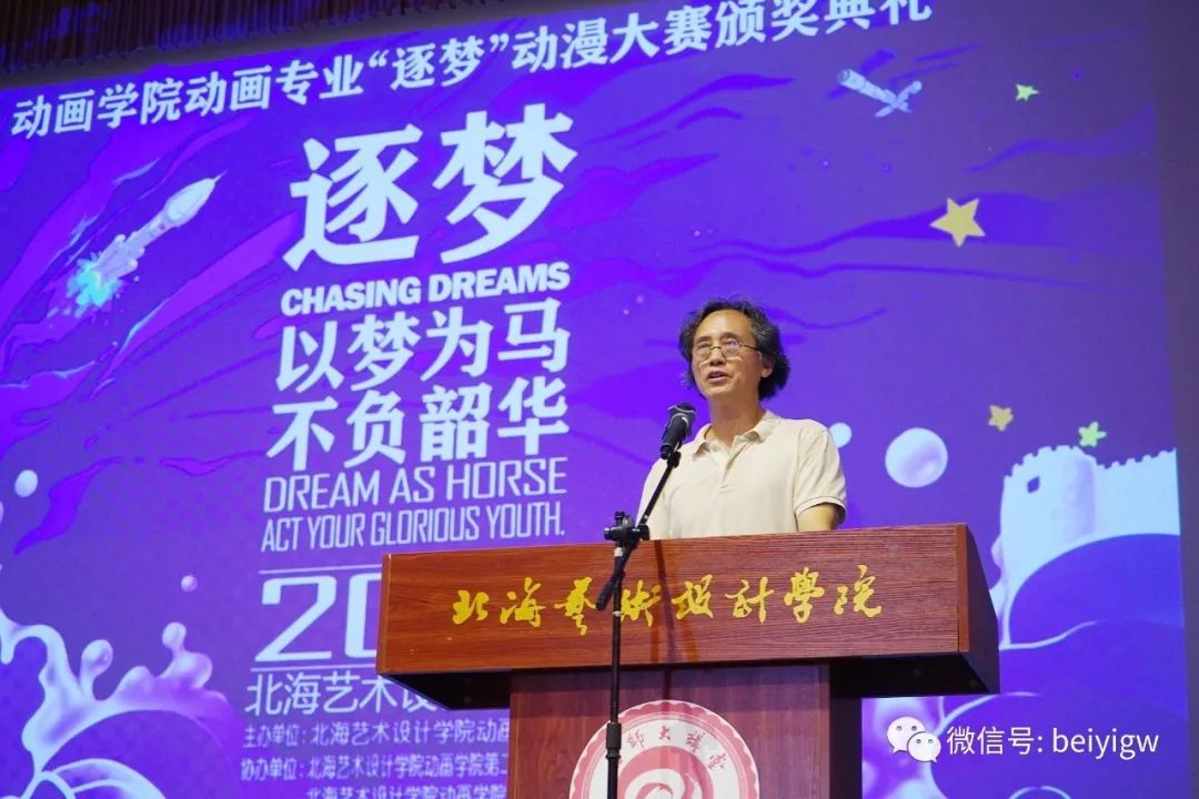 典礼上,卢新华校长致辞,他从动画市场结构、本校动画专业建设、师资水平、艺术水准、教学成果等方面详细介绍了我校动画专业的基本情况,并为为即将奔赴北京的18级学生们送上了真挚祝福与期许。他表示,作为一名动画专业学生,要如此次大赛主题一般,勇敢的去“逐梦”,将自己的梦想向爱情一样经营和呵护,将中国的动漫事业发扬光大才不负韶华。