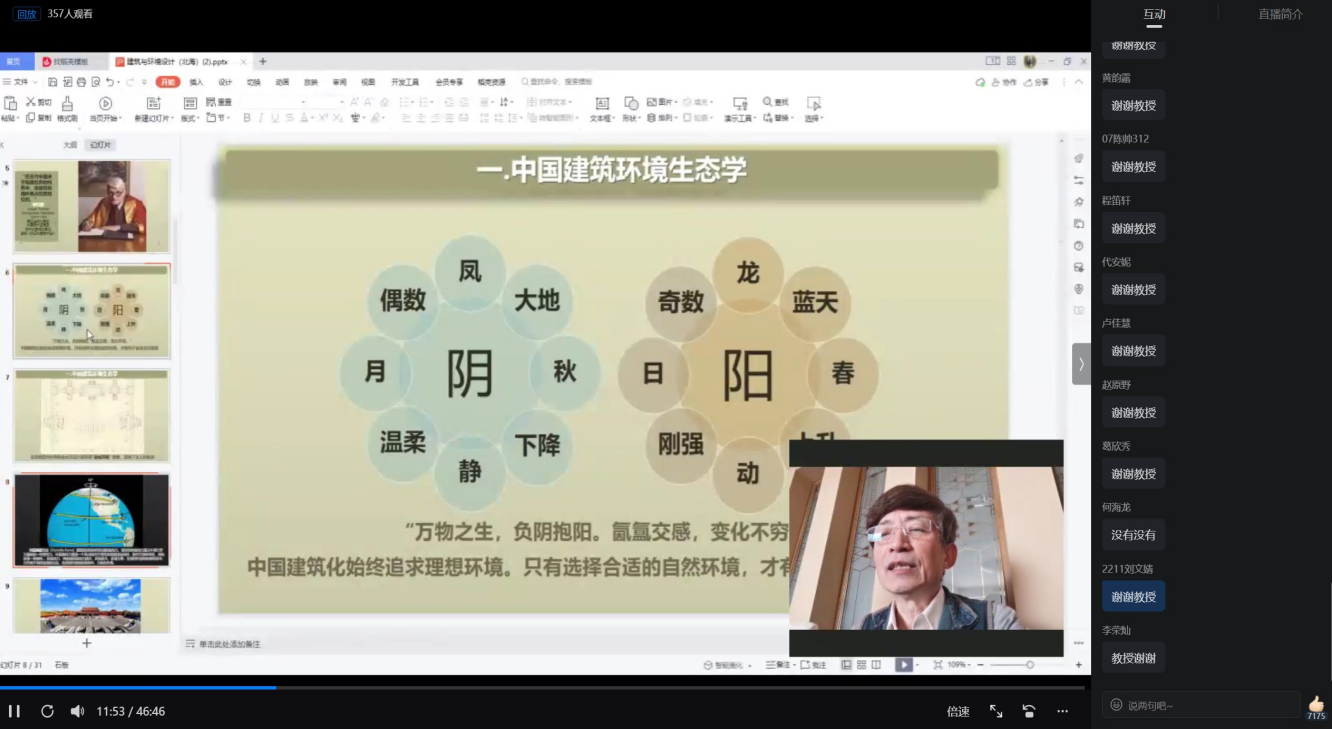 随后,李沙教授讲解了环境艺术设计与建筑学不仅是相互联系的,它们还同属于造型艺术,在技术方面的要求非常相近,两者之间存在的文化底蕴也非常相似。李沙教授还提到了中国古代建筑环境选址以及阴阳方面的知识,同时他也强调“万物之生,负阴抱阳,中国建筑化始终追求理想环境。”