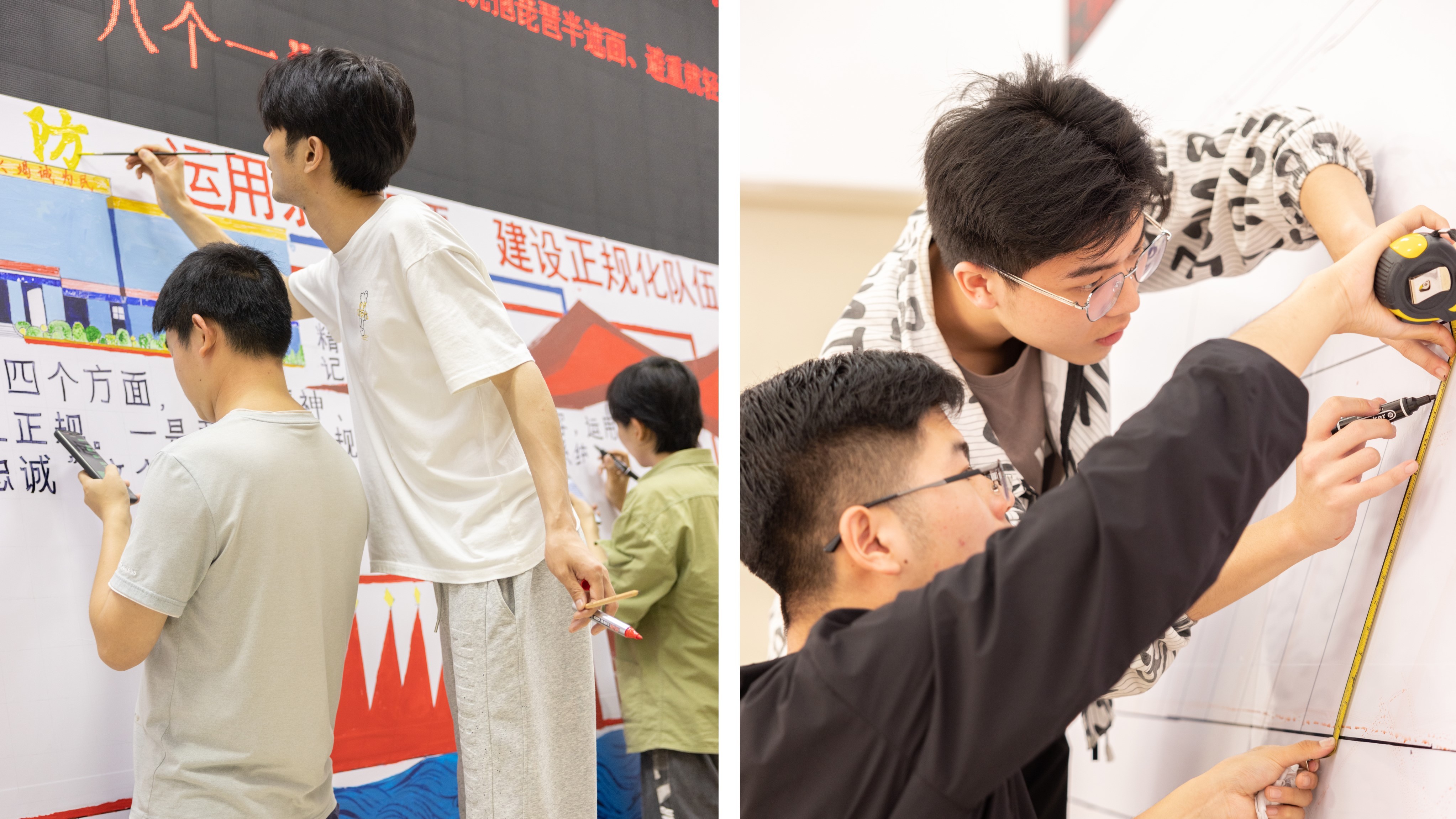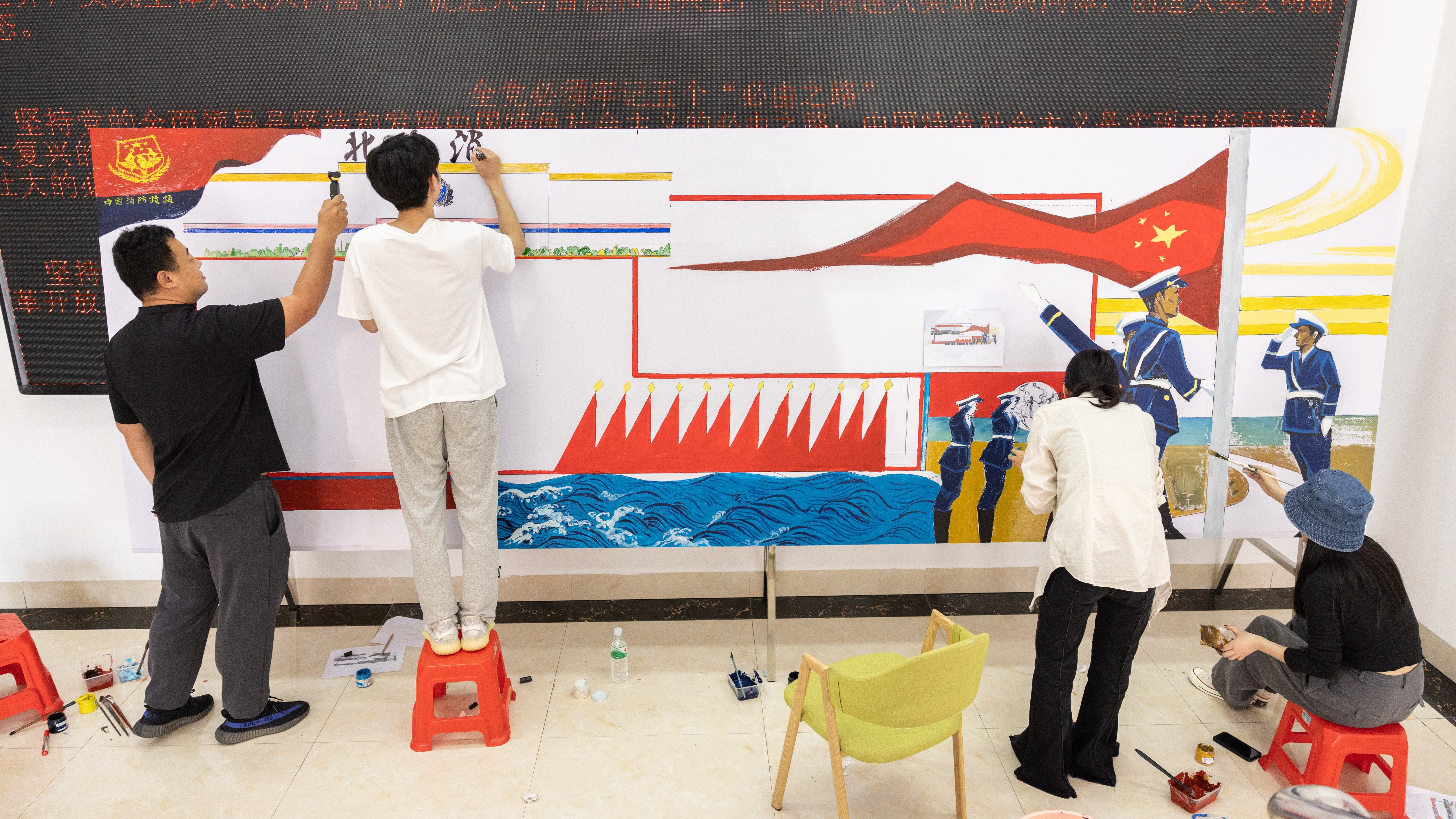 3月18日,美术学院副院长龚为、党总支副书记鲁明阳,带领6名老师和2名学生赴北海市消防救援支队南珠消防救援站开展社会服务活动,为救援站设计并绘制以“运用条令纲要,建设正规化队伍”为题的宣传板报。