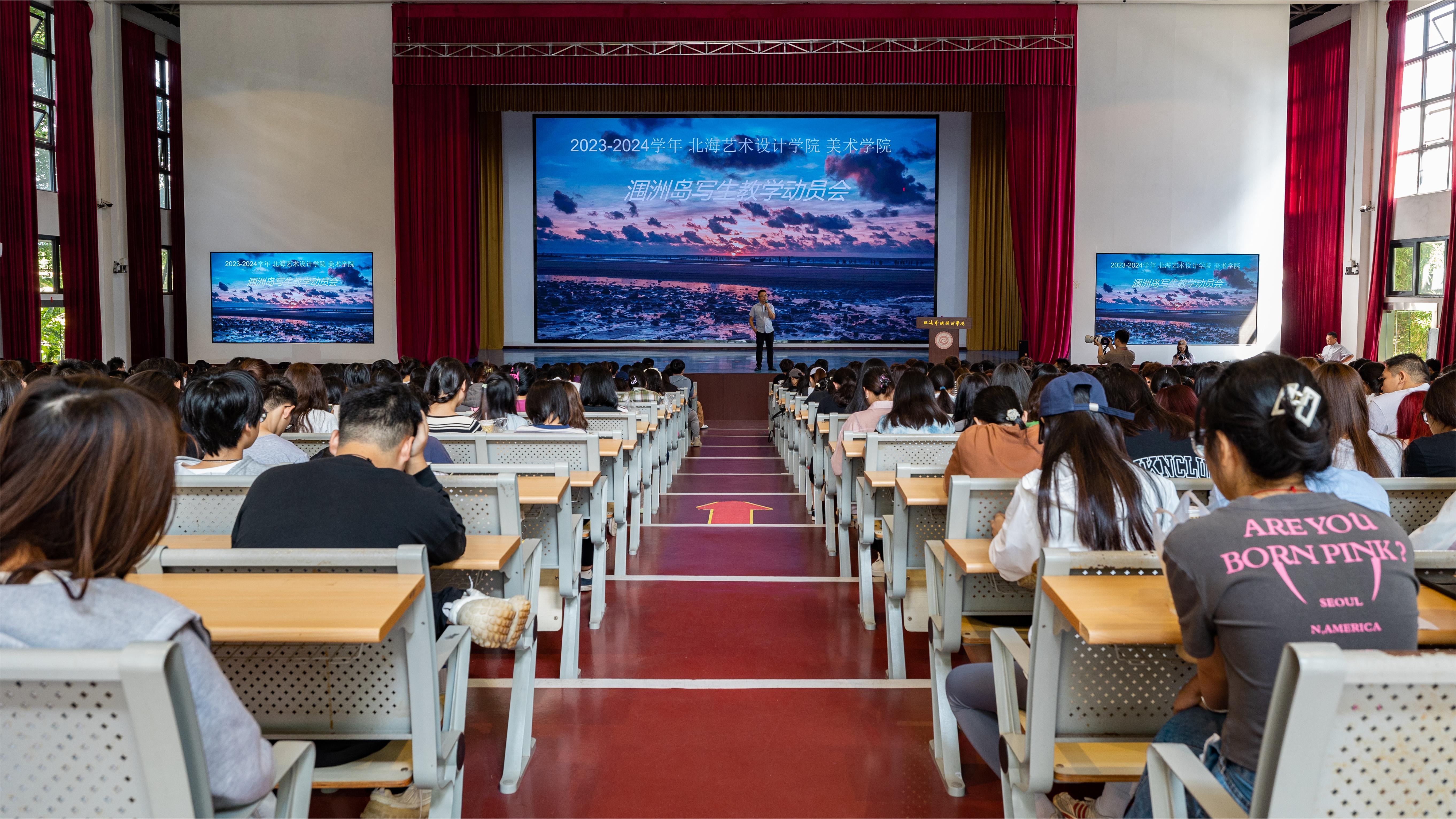 20231015日上午,美术学院2023级全体同学于西校区大礼堂参与2023级学生涠洲岛写生实践动员大会。本次会议由美术学院副院长龚主持,副书记鲁明阳、副院长殷声、基础教研室主任刘培培、写生课程全体指导教师出席参加。