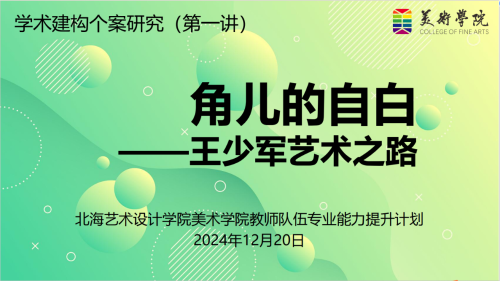 12月20日下午,美术学院在艺术楼314教室成功举办了“教师队伍专业能力提升计划”系列课程的第一讲。本次授课以“角儿的自白——王少军艺术之路”为主题的讲座形式开展,由美术学院雕塑专业学科带头人、著名雕塑艺术家王少军教授主讲。此次讲座标志着“北海艺术设计学院美术学院教师队伍专业能力提升计划”正式启动。讲座由学院办公室主任李康楠主持,出席人员包括院长刘斌教授、执行院长龚为教授、副院长金凯婧、副院长陈建江以及雕塑、绘画、美术学专业的专任教师。
