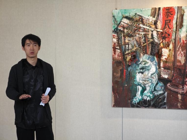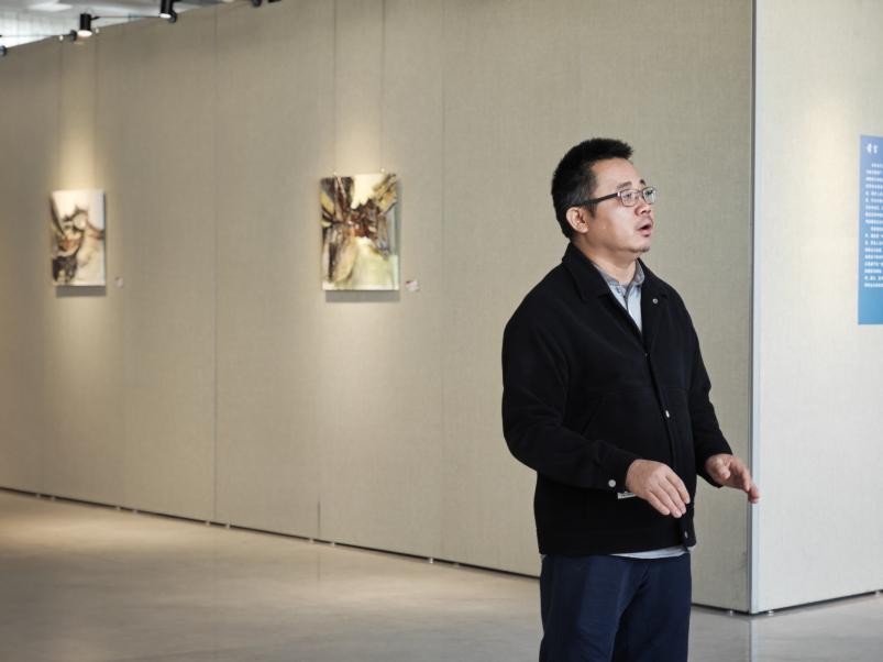 展览的主创者王云龙老师最后发言,分享了创作这组作品的初衷和背后的哲学思考。“在现当代艺术的脉络中,现象学与表现主义的交汇为我们提供了一种新的方式来解读文化和空间的意义。海德格尔的现象学理论强调“存在”的显现,并试图揭示世界的本真面貌,而表现主义则通过夸张与扭曲的手法,揭示人类内心的深层情感和存在的困境。侗族建筑,作为中国传统文化的重要组成部分,它不仅承载着历史的记忆,更是一种具有深厚文化根基的空间语言。通过这两种视角的交融,我们得以重新审视和解读当代侗族建筑的文化符号及其内在的精神结构。侗族建筑独特的构造形式与美学,正如海德格尔所言,建筑是一种“居住”的表现,它不仅是物理空间的界定,更是人与周围环境、人与他者之间关系的体现。而表现主义绘画,则通过视觉语言的张力和情感的爆发,呈现出个体与环境之间的张力与冲突。本次展览作品,正是基于这一现象学与表现主义的结合,通过对当代侗族建筑的描绘,表达对其精神和艺术形式的敬意与思考。最后,艺术语言能够重新连接这些当代建筑形式,同时也为未来的文化传承和复兴提供一种新的可能性。”