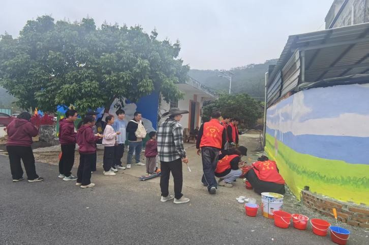 井山村“小洱海”墙绘项目以“红色文化”“农耕文明”“生态旅游”等为主题,30余名师生从调研、设计、实施总计耗时3个月,在五百平方米墙面上创作《红色文化》《渔耕四季》《柿柿如意》等系列作品,将当地特色文化、田园风光转化为可互动的视觉符号,打造“一步一景”的沉浸式乡村文旅体验,验收现场,庞丽副乡长表示:“墙绘不仅扮靓了村容村貌,更让村民在艺术熏陶中增强了文化自信。”
