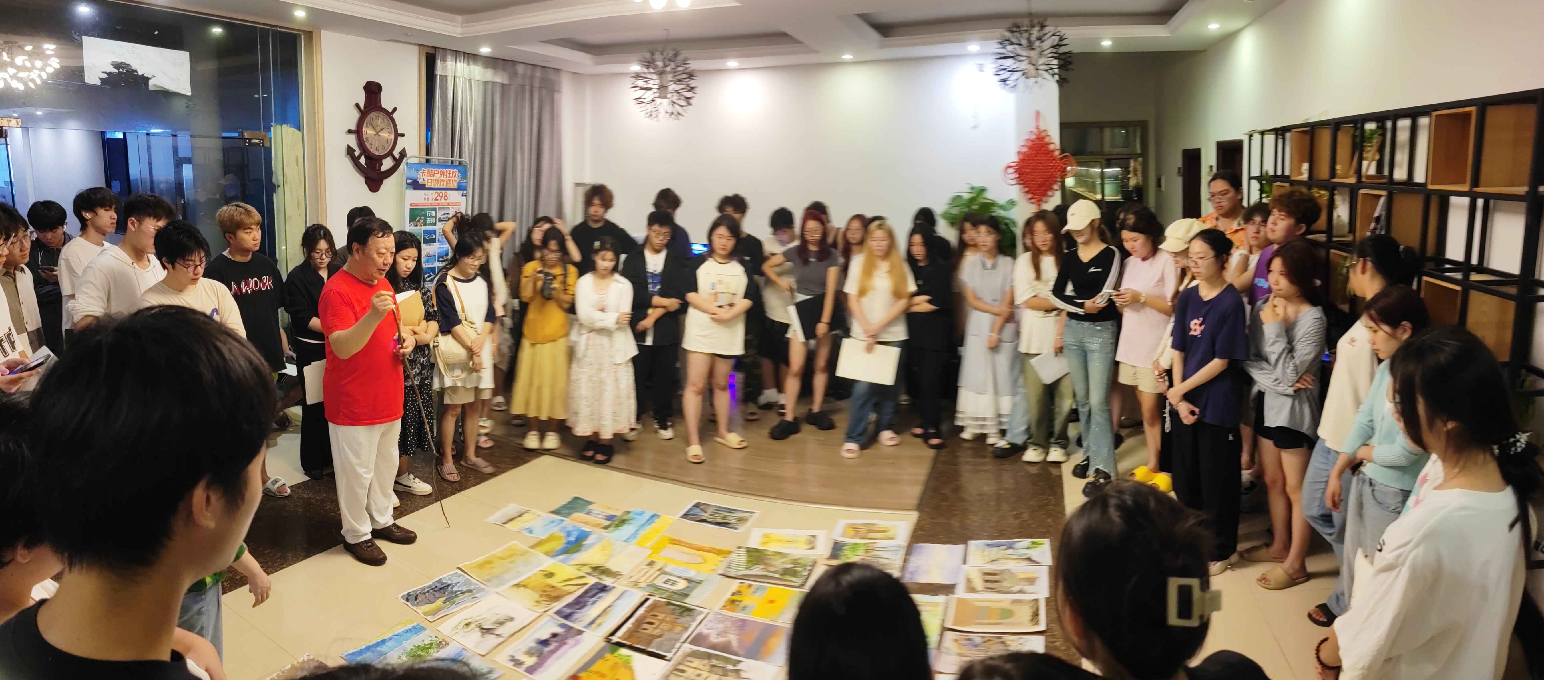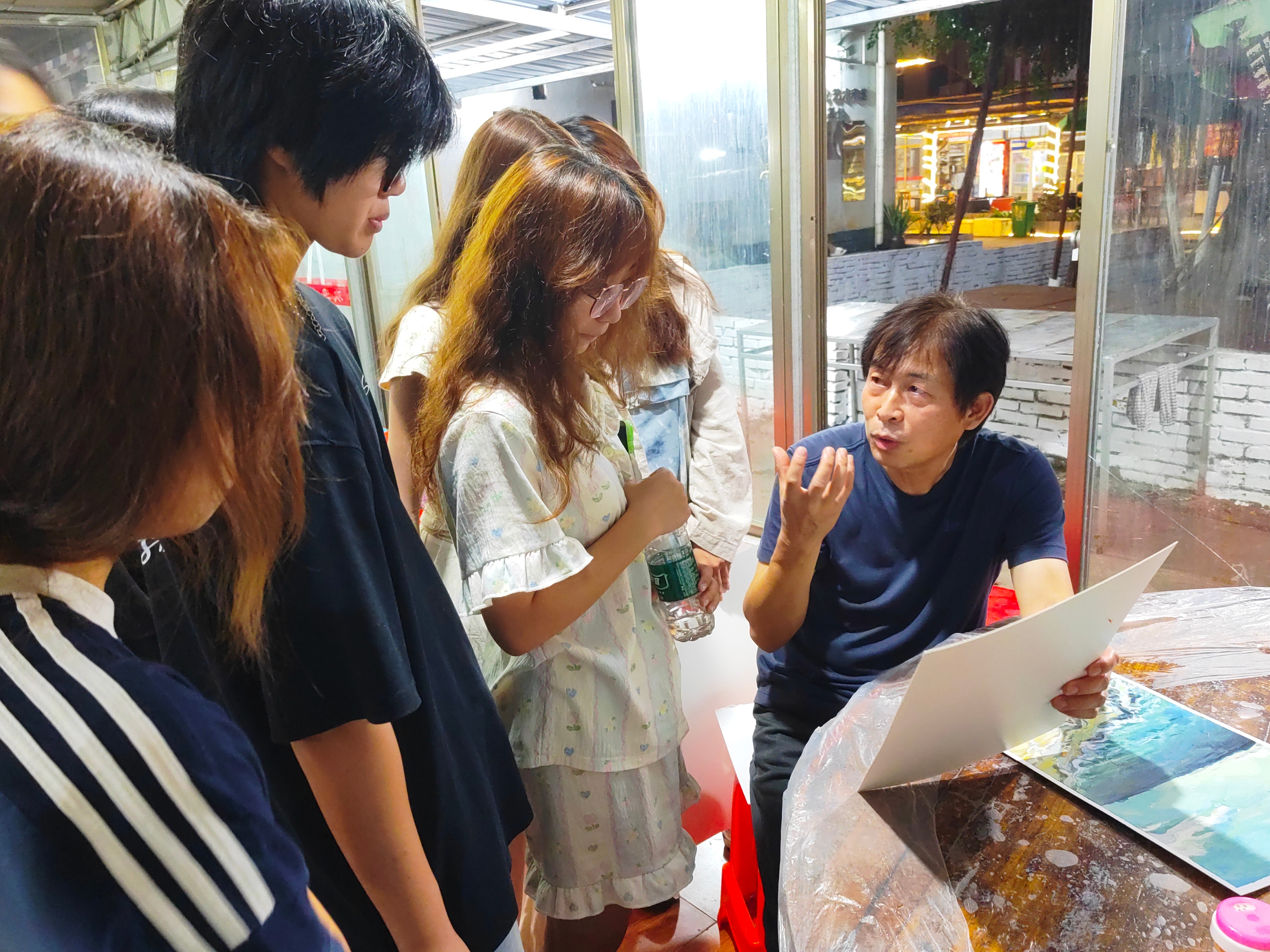 在涠洲岛期间,师生们分别前往南湾码头、天主教堂、鳄鱼山景区等地标性景点。通过“现场写生”与“环境考察”相结合的方式,捕捉自然生态与人文景观之间的共生之美,赋予作品生命力。在此过程中,位教授在现场传授专业技艺,创作高质量范画。在课后,老师围绕作品的构图布局、色彩运用、情感表达等多个维度对学生们的作品进行点评,指出亮点不足同时解决创作过程所遇实际问题,以期同学们创作更多优秀艺术作品
