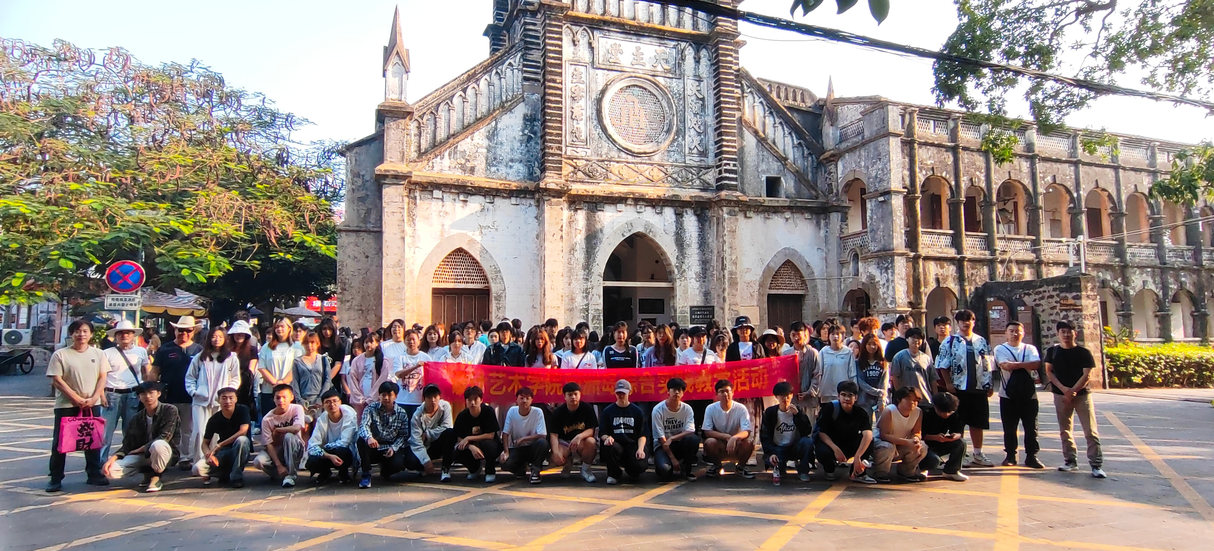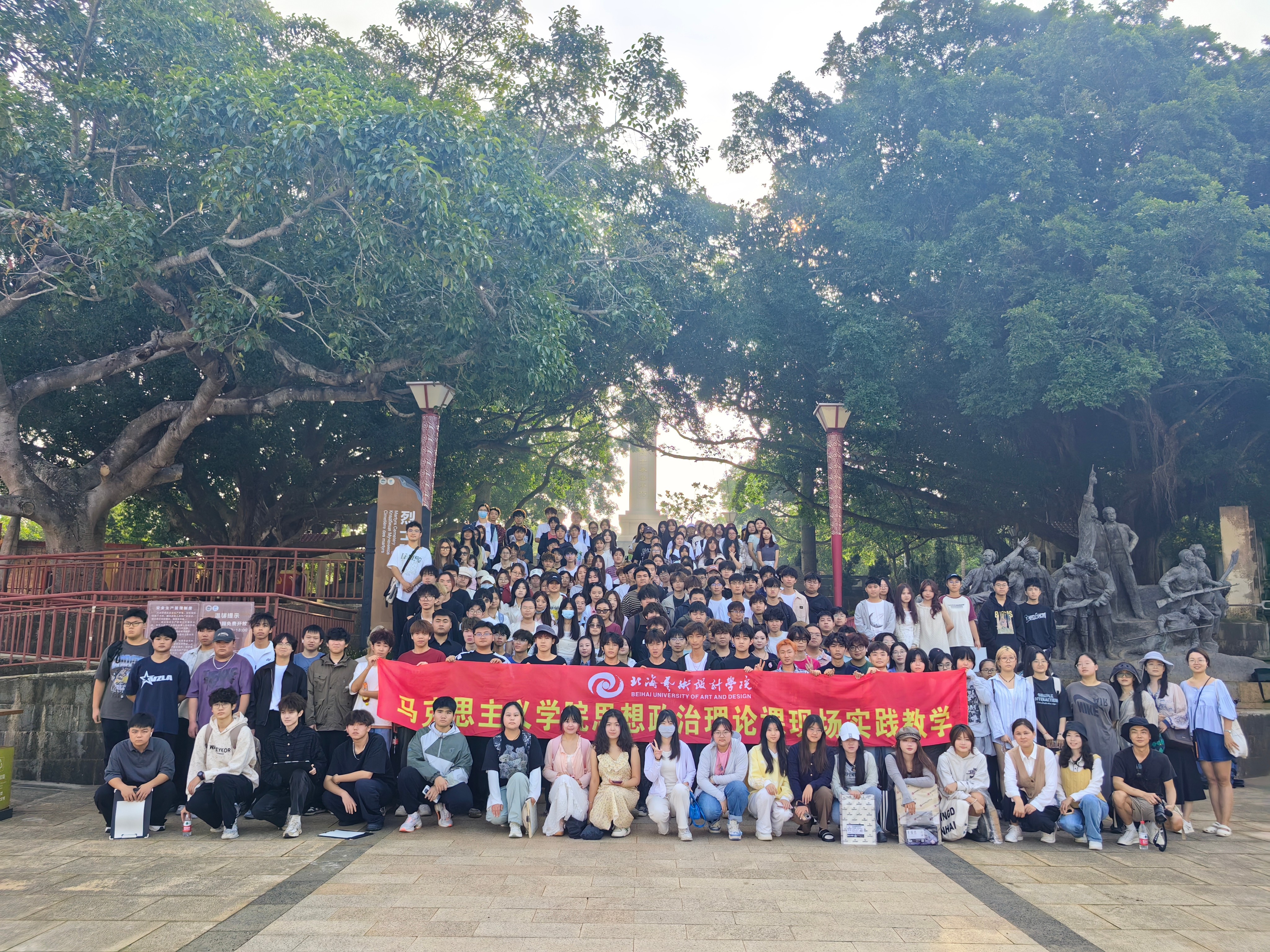 与此同时学院组织同学们前往涠洲岛红色旅游景区,这片位于岛湾背山坡的革命历史纪念地,见证了岛屿的烽火岁月。在庄严肃穆的红色广场上,学生们参与了一场“红色革命历史现场教学”。马克思主义学院专任教师李妙燕文姣丽通过讲授学生们探索“革命历史”的深厚内涵,实现了一次深刻的“思政教育”与艺术实践的融合。