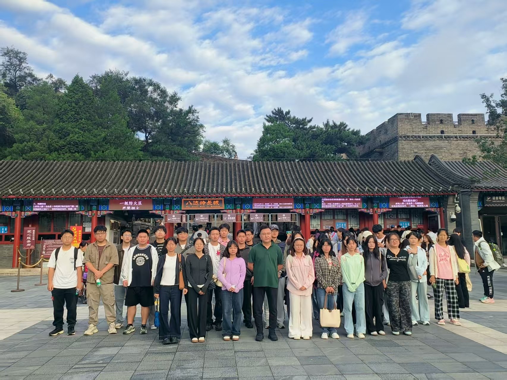 “不到长城非好汉”,8月24日上午前往八达岭长城,开展以“感悟长城精神,增强文化自信”为主题的实践考察活动。长城不仅是中国古代军事防御工程的奇迹,更是中华民族团结奋进、自强不息精神的象征,而散布在长城关隘、阁楼中的题刻与匾额,也成为书法艺术与民族精神融合的独特载体。当日清晨,站在长城之巅,远眺群山连绵、城墙如巨龙盘踞,学生们无不被眼前的雄伟景象所震撼。