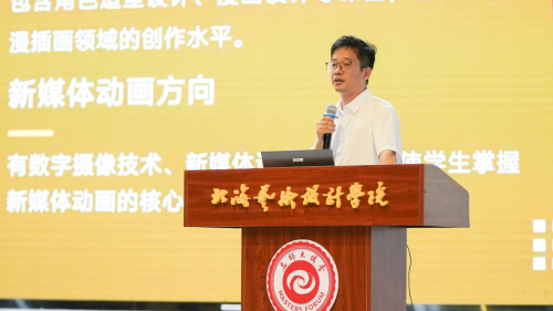 分方向讲解环节由动画教研室副主任庄凯丽、黄燕程和梁家铭对动画专业下设新媒体动画、漫插画、三维动画3个专业方向的相关情况进行介绍。庄凯丽对新媒体动画方向的介绍以AI视频引入,强调AIGC时代文字表达与AI协同创作的重要性,鼓励学生辅修汉语言文学提升素养,并介绍该方向突破传统材质、探索新视觉形式的优势;黄燕程围绕“视觉表现力、技术适配性、AI协同力”,指出保持创作主动性是核心,全面介绍了漫插画方向的课程模块与就业前景;梁家铭通过回顾动画专业2004年以来的发展,展示师生优秀作品,结合《哪吒》等作品分析行业前景,彰显三维动画方向的教学实力和美好前景。