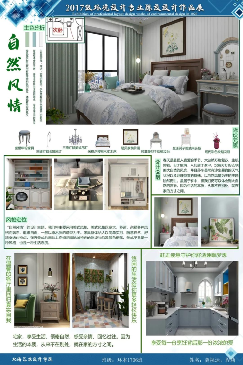 课程最终的设计任务是以疫情期间学生生活的居室空间环境为载体,以服务地区经济为己任,以反映其生活当地的特色地域文化为设计素材,完成一套具有地域特色家居陈设设计方案,其中包含方案的成本预算。同学们的作品大部分表现优良,能反映出学习态度端正和娴熟使用新的设计软件,设计理念先进,制作细致认真,具备发现问题、分析问题和解决问题的能力。学生对于陈设设计的课程体系及设计原理掌握较为深入具体,作品主题突出,风格鲜明,图示表现符合市场需求,顺利地完成了本次课程的教学任务。