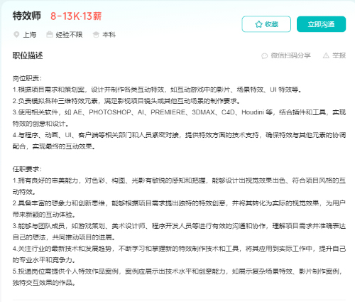 岗位职责: 1.根据项目需求和策划案,设计并制作各类互动特效,如互动游戏中的影片、场景特效、UI 特效等。 2.负责模拟各种三维特效元素,满足影视项目镜头或其他互动场景的制作要求。 3.使用相关软件,如 AE、PHOTOSHOP、AI、PREMIERE、3DMAX、C4D、Houdini 等,结合插件和工具,实现特效的创意和设计。 4.与程序、动画、UI、客户端等相关部门和人员紧密对接,提供特效方面的技术支持,确保特效与其他元素的协调配合,实现最终的互动效果。 任职要求: 1.拥有良好的审美能力,对色彩、构图、光影有敏锐的感知和把握,能够设计出视觉效果出色、符合项目风格的互动特效。 2.具备丰富的想象力和创新思维,能够根据项目需求提出独特的特效创意,并将其转化为实际的视觉效果,为用户带来新颖的互动体验。 3.能够与团队成员,如游戏策划、美术设计师、程序开发人员等进行有效的沟通和协作,理解项目需求并准确表达自己的想法,共同推动项目的进展。 4.关注行业的最新技术和发展趋势,不断学习和掌握新的特效制作技术和工具,将其应用到实际工作中,提升自己的专业水平和竞争力。 5.投递岗位需提供个人特效作品案例,案例应展示出技术水平和创意能力,如展示复杂场景特效、影片制作案例,独特交互效果的作品。