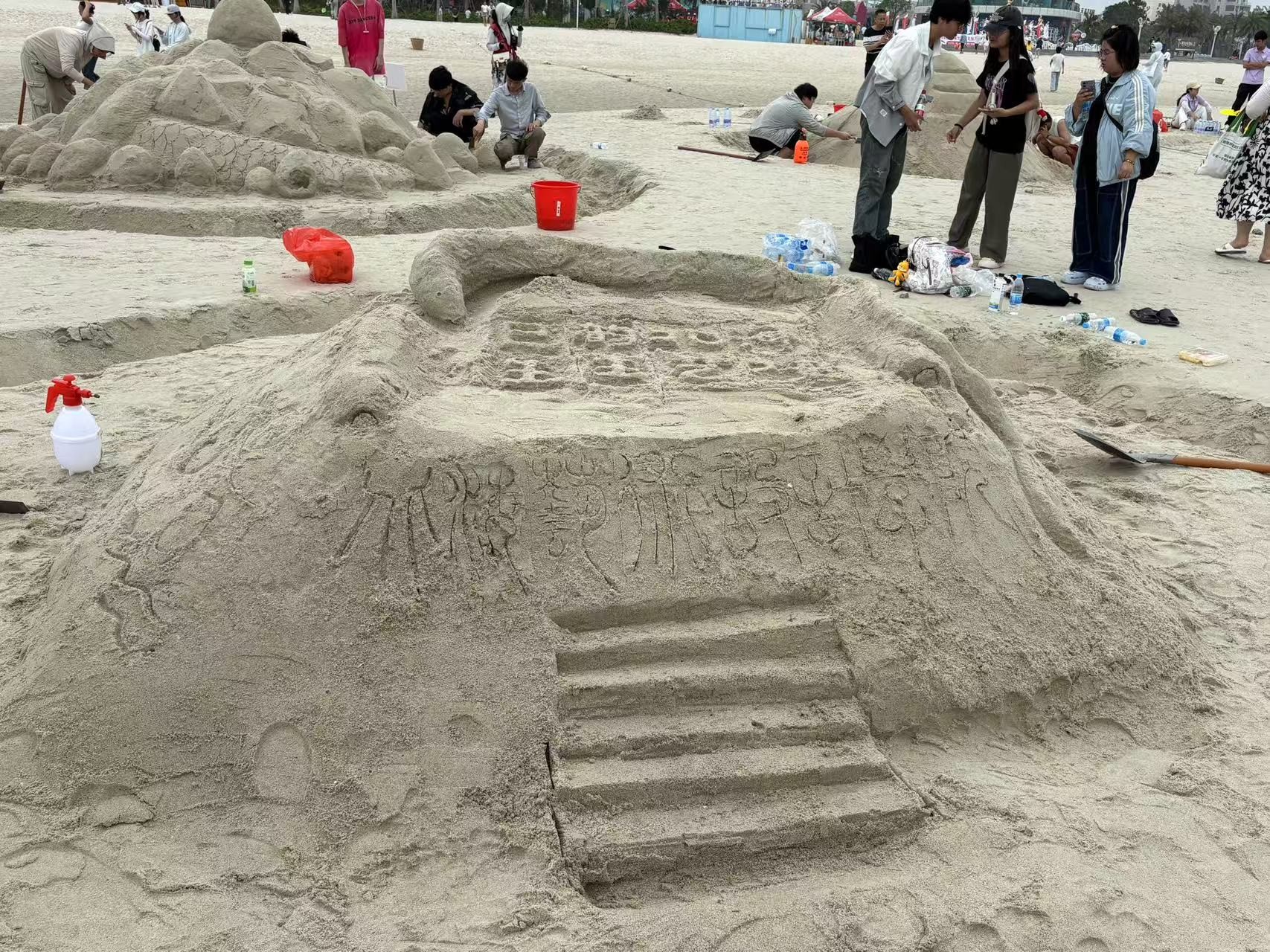 在沙滩排球赛场上,白色排球在蔚蓝天空与金色沙滩间穿梭,每一次精彩攻防都引发观众阵阵喝彩,水到渠成比赛考验团队默契,书法学院队员们手持U型槽,小心翼翼传递着水源。沙雕选手们更是巨型铲子、小水桶、雕刻刀等工具齐上阵,潮湿的沙粒在手中逐渐成型。还有同舟共济、袋鼠跳、巨人脚步等趣味项目,展现了书法学院学子在此次沙滩运动会中的运动活力。