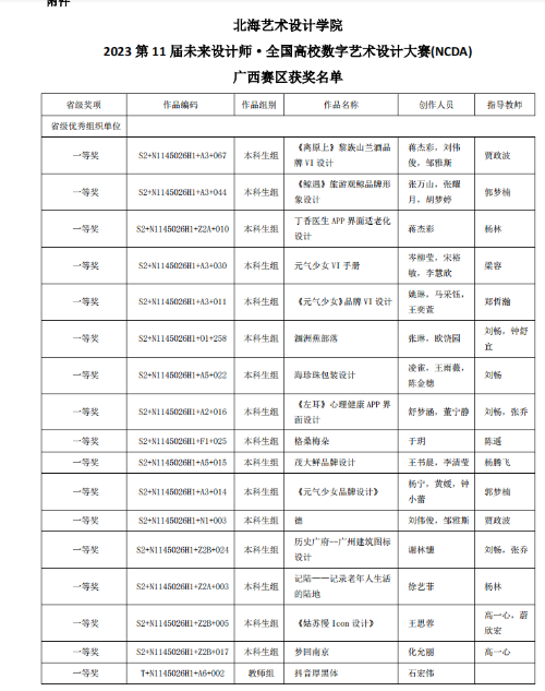 我院师生在2023第11届未来设计师·全国高校数字艺术设计大赛(NCDA)中取得优异成绩!共荣获全国赛区一等奖2项、二等奖4项、三等奖5项;广西区赛一等奖17项、二等奖20项、三等奖28项,学校荣获“省级优秀组织单位”奖。