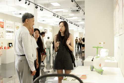 首先,贾荣建教授在发言中对学生的进步给予了充分的肯定,同时也指出了他们仍有的提升空间。针对学生们提出的学习疑问,贾教授进行了详尽且有针对性的解答。他特别指出,本次展览确实展现了学生们在设计基础和能力方面的扎实功底,但产品设计的细节方面仍有待深化,这样的努力将进一步提升他们的产品设计水平。