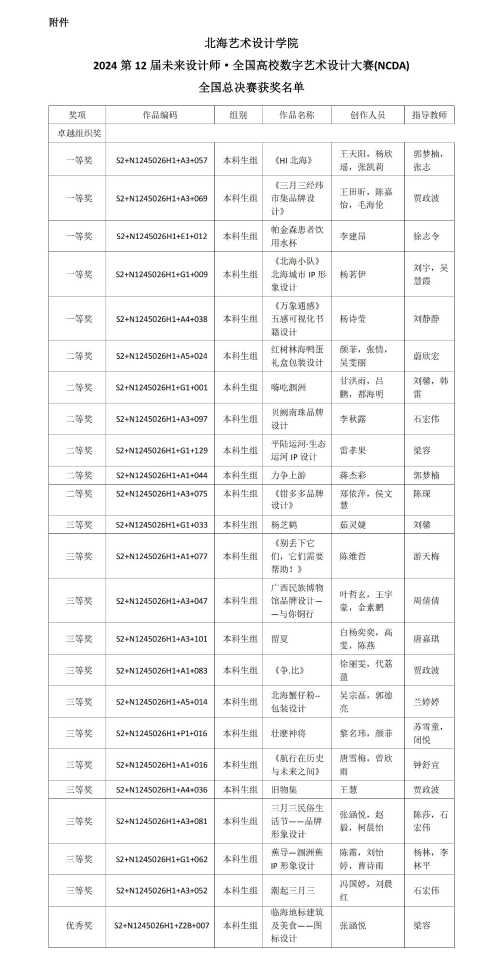近日,2024第12届未来设计师·全国高校数字艺术设计大赛(NCDA)和未来设计师·全国艺术设计教师教学创新大赛(NDTC)颁奖典礼在重庆举行。设计艺术学院师生在竞赛中取得优异成绩!共荣获全国一等奖5项、二等奖6项、三等奖12项、优秀奖1项;广西区赛一等奖45项、二等奖32项、三等奖40项;“优秀指导教师奖”19项;“优秀组织教师奖”1项;我校荣获“卓越组织奖”。