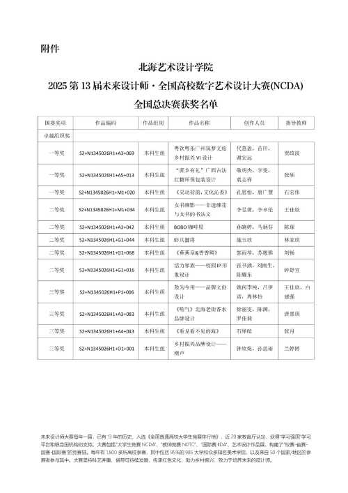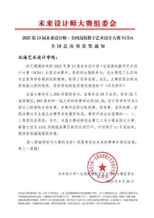 未来设计师·全国高校数字艺术设计大赛(NCDA)是入选《全国普通高校大学生竞赛排行榜》,近20家教育厅认定,“学习强国”学习平台支持,对接联合国国际赛的全国性大学生竞赛。大赛始于2012年,每年举办一届,已连续举办12届,为艺术设计领域的高水平知名赛事,是高校积极参与的重要竞赛之一。