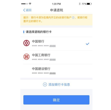 进入银行卡选择界面,会自动带出添加好的银行卡。您也可以点击【添加银行卡信息】。
