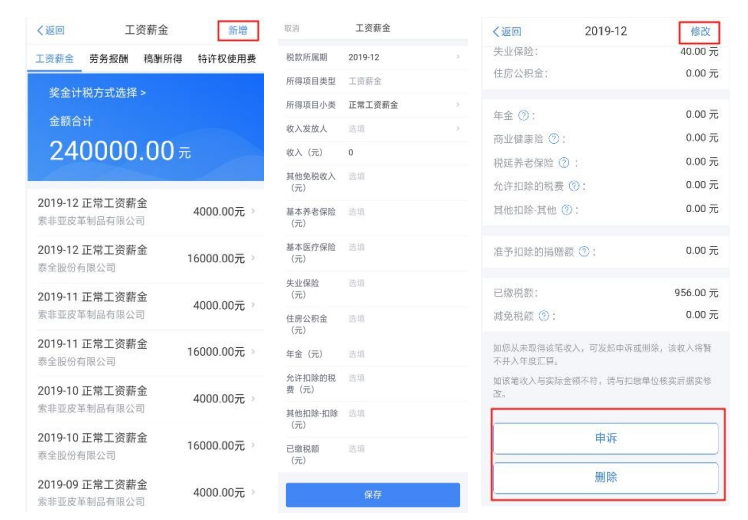 点击除专项附加扣除之外的明细数据可进入对应详情 界面,您可进行【新增】、【修改】、【删除】、【申诉】等操作,步骤同前一步的(一)完善收入数据一致。