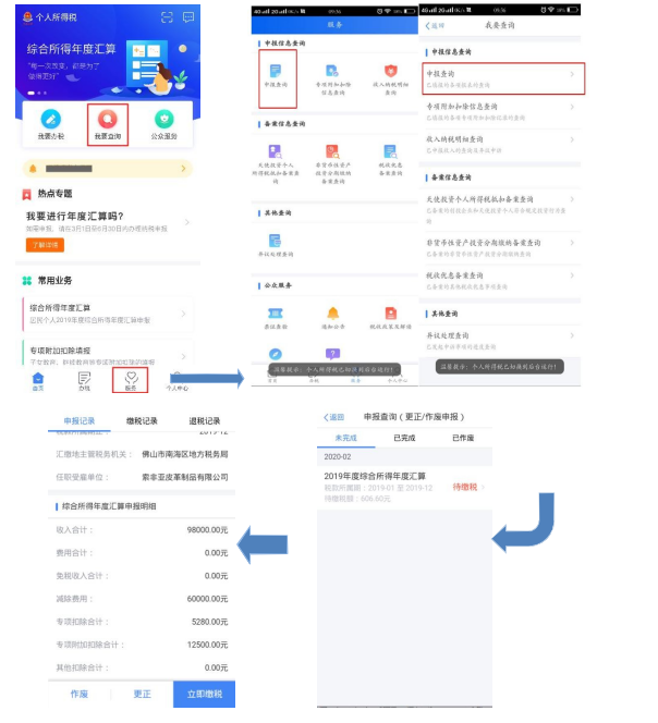 使用手机APP 端申报,您可以从以下入口进入年度汇算: 一是从首页的【常用业务】区块的【综合所得年度汇算】进入;二是从【快捷入口】-【我要办税】下或底部【办税】菜单进入后,点击在【税费申报】下的【综合所得年度汇算】。