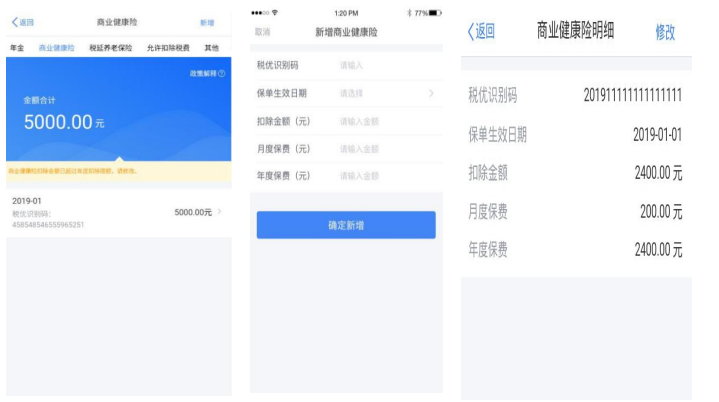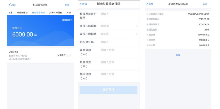 在其他扣除明细列表界面,您可点击【商业健康险】、【税收递延养老保险】页面,分别进行新增和修改。