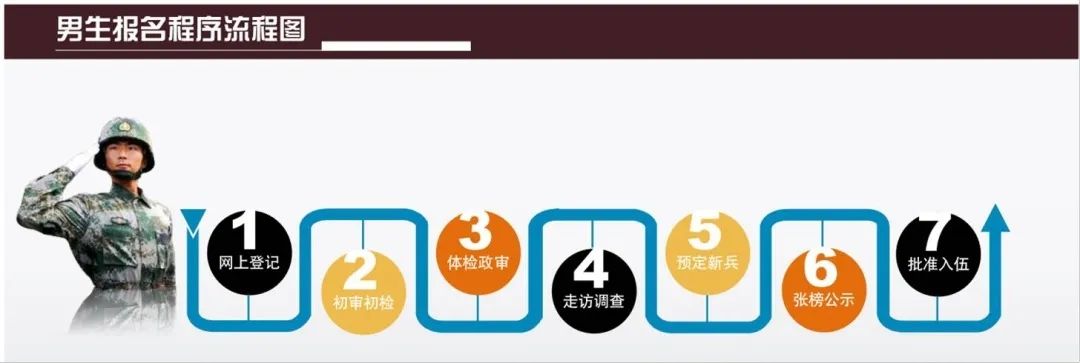 参加兵役登记及报名:①上半年应征报名于2月15日前,下半年应征报名于8月15日前登录“全国征兵网”(http://www.gfbzb.gov.cn),参加网上兵役登记和应征报名。完成报名后,在校大学生和毕业生需打印《大学生预征对象登记表》和《高校学生应征入伍学费补偿国家助学贷款代偿申请表》(各一式两份),及时提交到就读的高校征兵工作站和应征地县(市、区)武装部审核盖章。