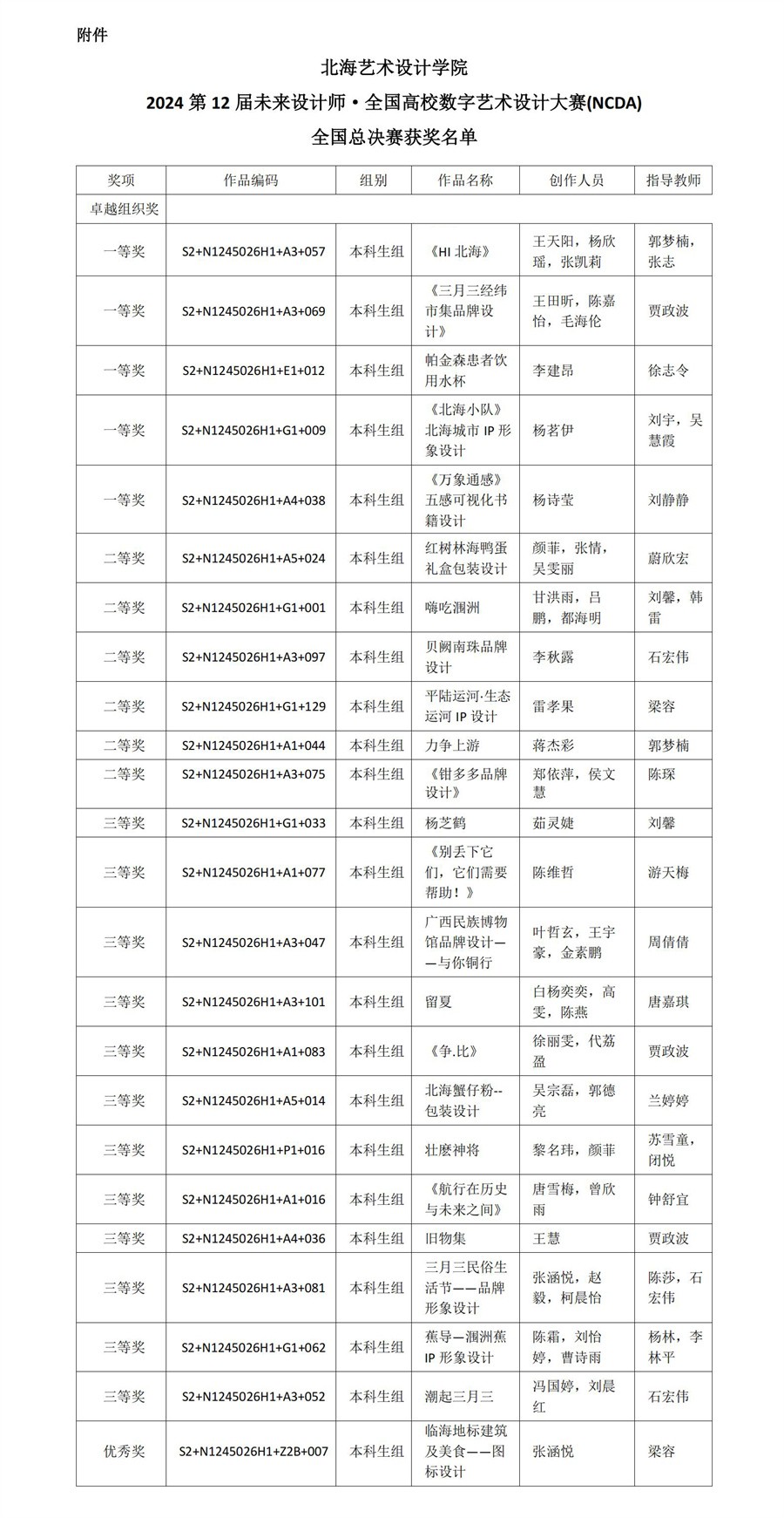 近日,2024第12届未来设计师·全国高校数字艺术设计大赛(NCDA)全国总决赛落下帷幕。设计艺术学院学生在此次大赛中共荣获全国一等奖5项、二等奖6项、三等奖12项、优秀奖1项;获广西区赛一等奖45项、二等奖32项、三等奖40项;设计艺术学院获教师组广西赛区二等奖1项、三等奖1项。