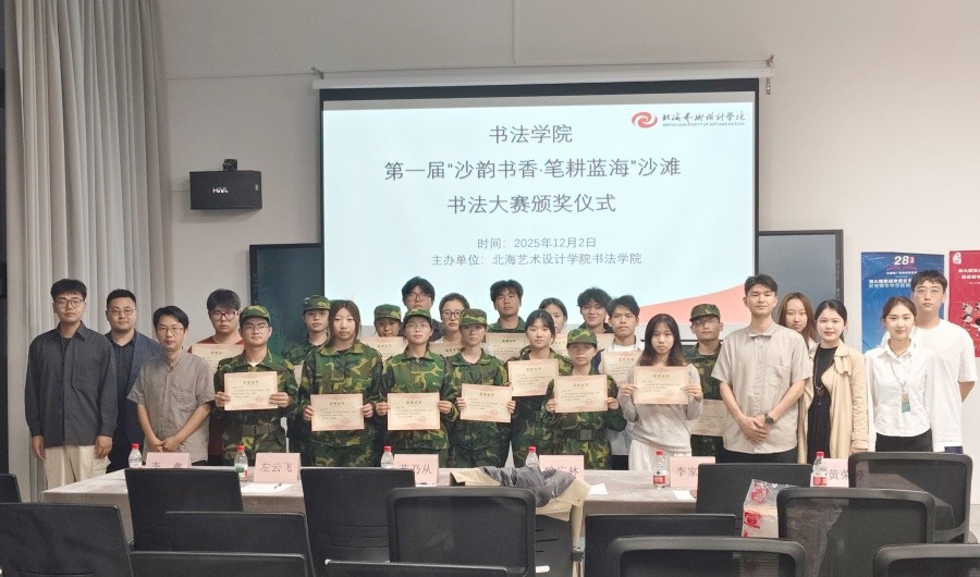 12月2日,大赛颁奖仪式在学校艺德楼507室举行。书法学院常务副院长苏乃从,党支部书记喻广林、副书记左云飞,副院长李家琪、黄荣婷,书法学教研室主任李鑫出席仪式,并为获奖学生现场颁发荣誉证书。颁奖环节后,获奖学生代表孙啸宇、李利合先后上台,分享了本次沙滩书法创作的思路方法及涠洲岛写生期间的灵感来源,为在场同学提供了宝贵的实践经验参考。