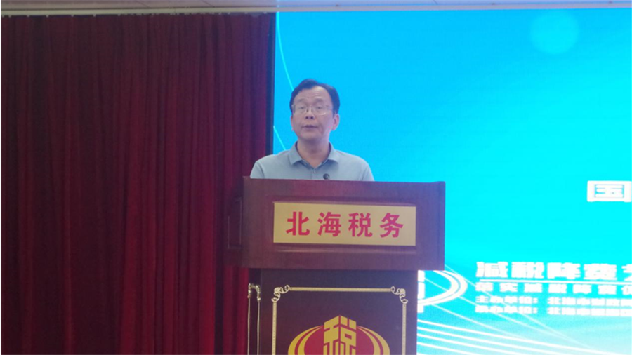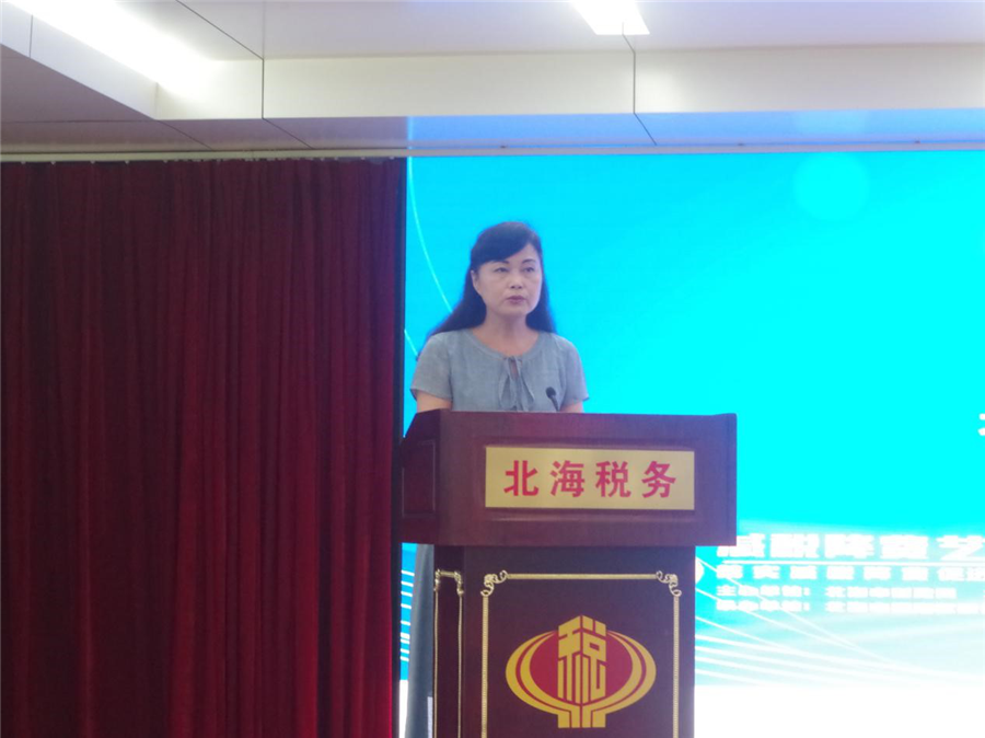 北海税务局副局长农志军进行发言,他对本次承办大赛的各单位表示感谢,对同学们积极响应参加比赛并获奖表示欣慰。