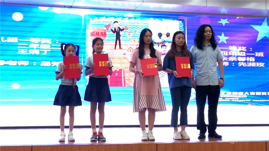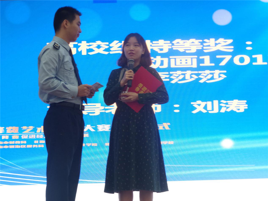 北海艺术设计学院动画专业李莎莎获高校组特等奖,由北海市财政局调研员兼副局长黄文进行颁奖;北海艺术设计学院附属学校杨冰冰获少儿组特等奖,由北海市税务局副局长农志军颁奖。